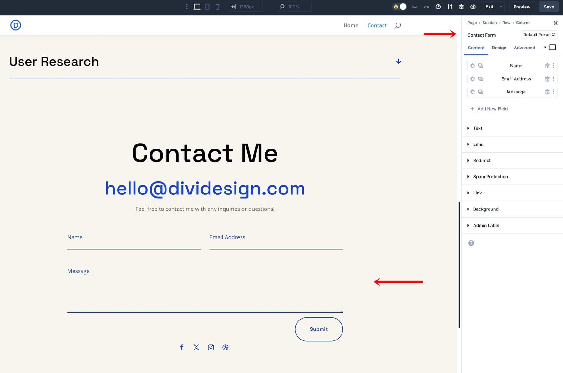 For this particular example, we’re going to use the contact page that is included in the Design Portfolio Layout Pack. Once you create a new page, upload this layout (or any other contact layout). Then, open the settings of the Contact Form Module that you’ll find inside that layout.