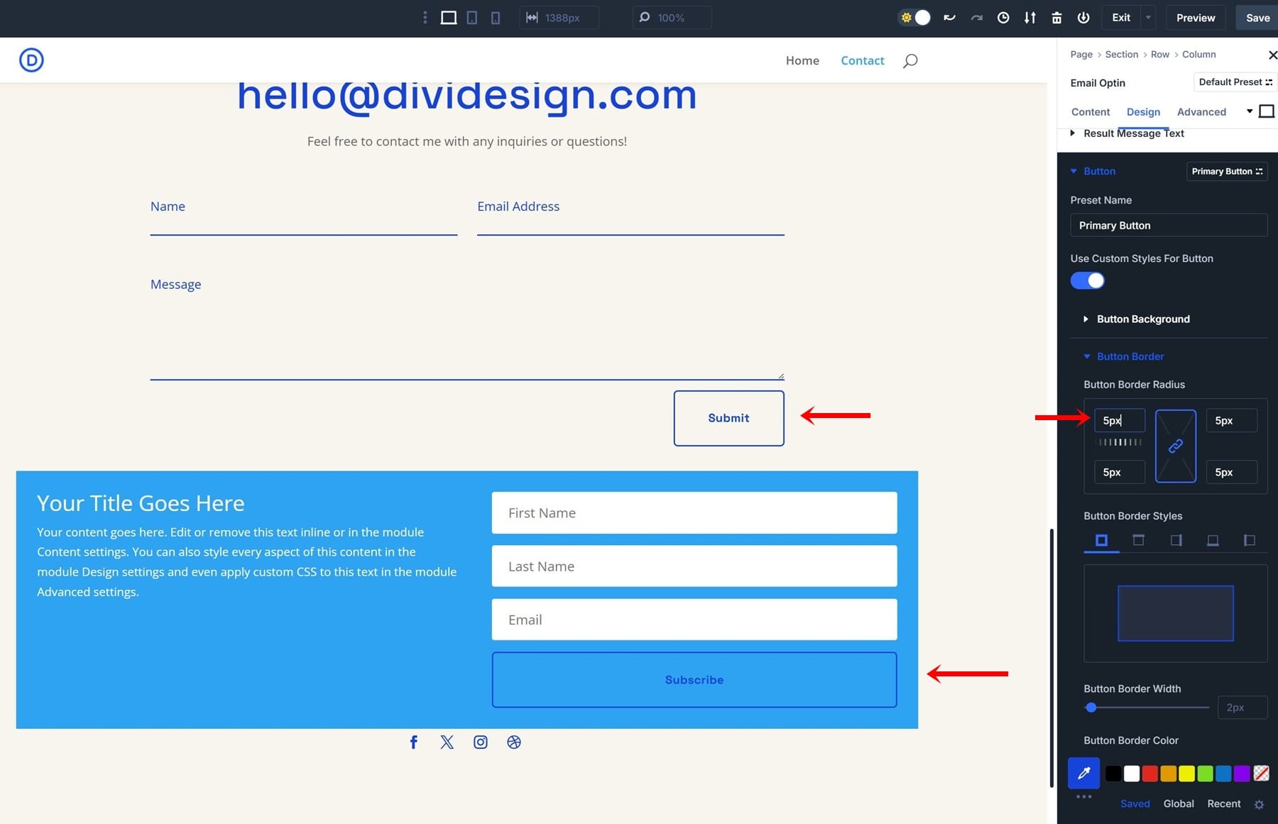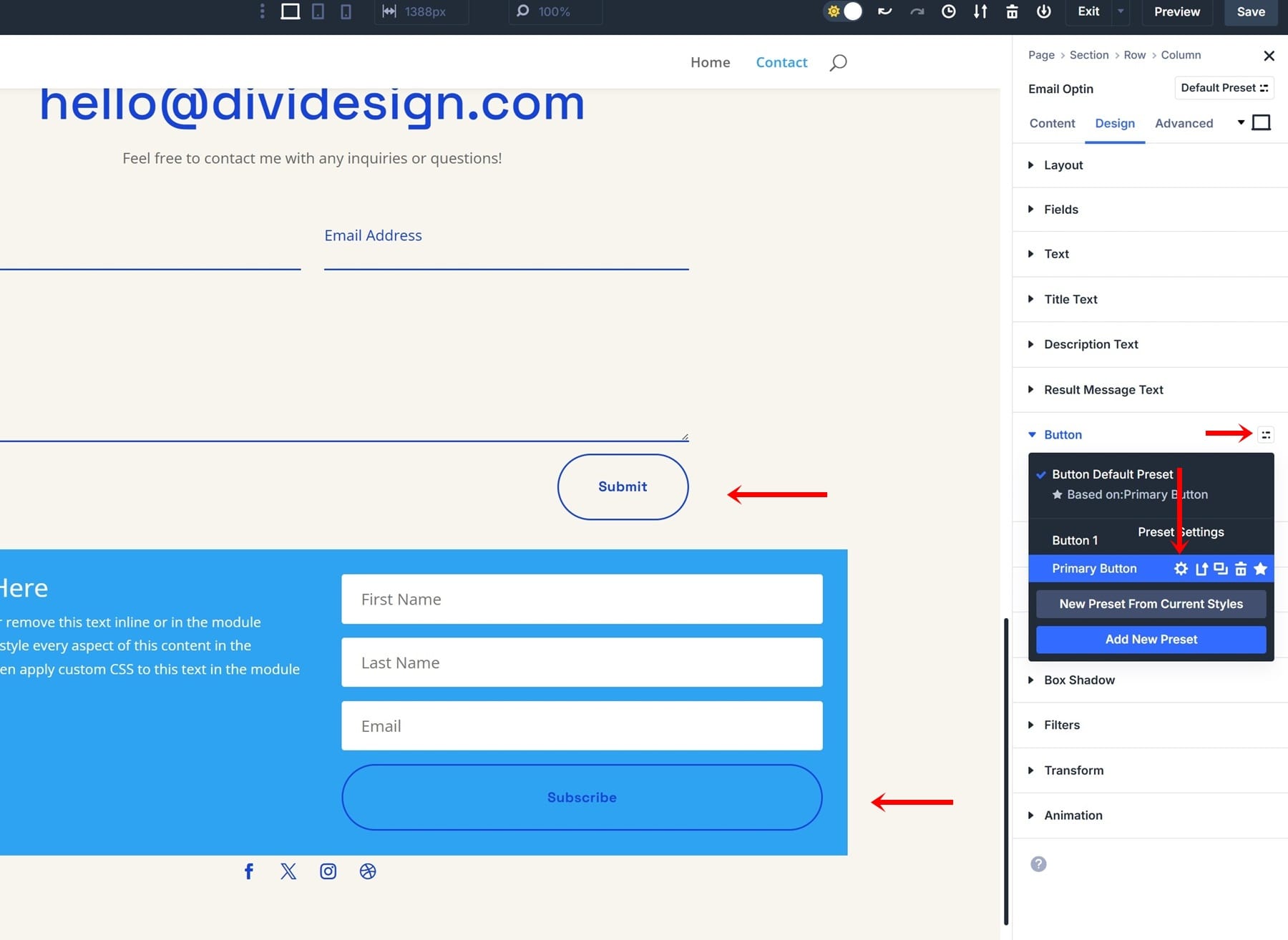 To see your new preset in action, add an unstyled brand-new Email Optin Module right below your Contact Form Module.