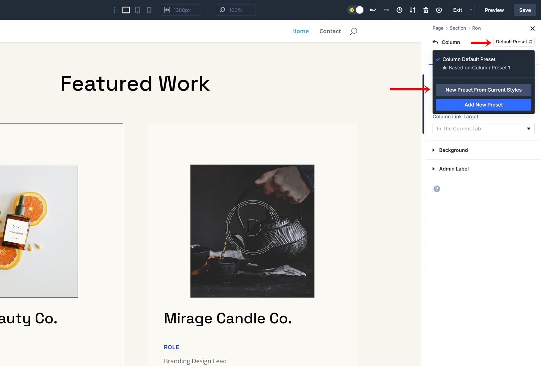 Now, navigate to the second column of your row. I’ve made sure that column 2 doesn’t have any overriding element-level settings. Once you’re there, enable the preset you made in the previous step.