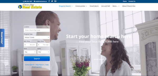 Choice One Real Estate includes a full-screen video background with property search prominently placed on the homepage. Scrolling reveals a menu strip, a post slider, a Real Estate IDX property search map powered by iHomefinder, a listings slider, CTA, about, a property search using dropdown boxes, blog section, and custom footer. This site includes a complete IDX integration to display multiple search features, listings, agent list, and makes great use of branding.