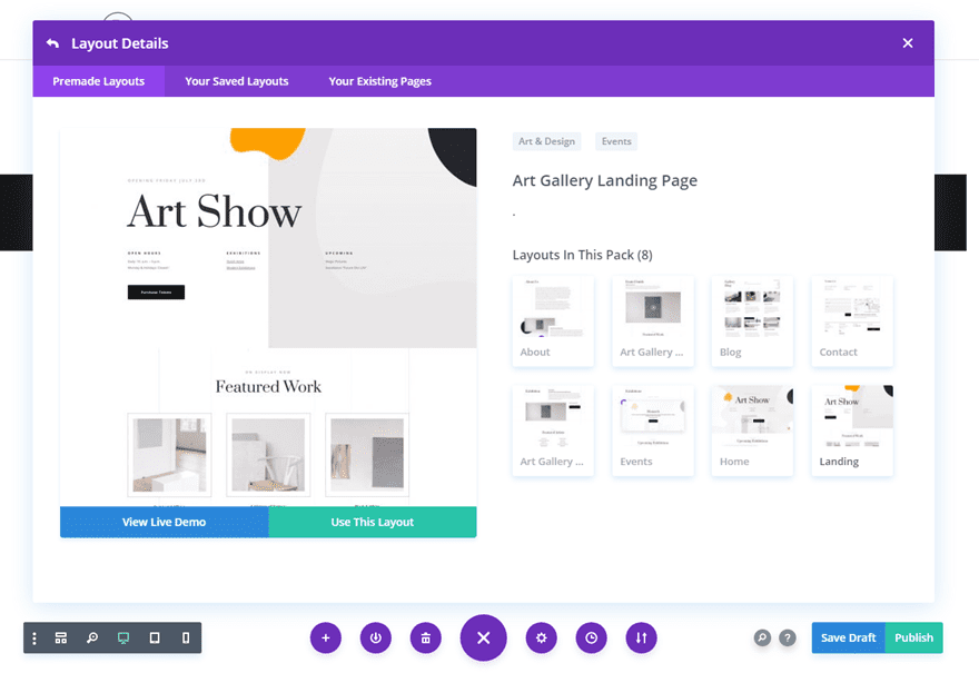 To access your new layout, simply activate the Visual Builder when editing a page and look for the “Load From Library” icon in the page settings bar (it looks like a plus symbol). Click this icon to launch the Load From Library popup. Under the Premade Layouts tab, you can easily find the new layout by scrolling through the list of layout packs. Once you find the Art Gallery Layout Pack, click on it. You will see all the individual layouts included in the pack. Select the layout you want for to use and then click the “Use This Layout” button.