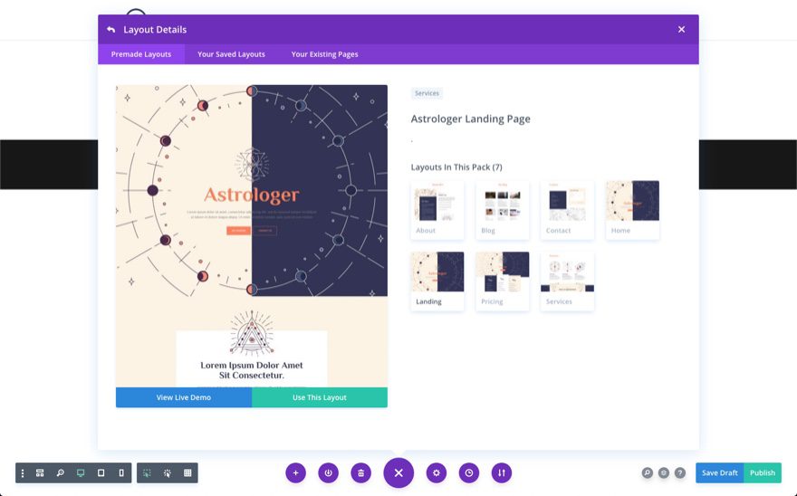 To access your new layout, simply activate the Visual Builder when editing a page and look for the “Load From Library” icon in the page settings bar (it looks like a plus symbol). Click this icon to launch the Load From Library popup. Under the Premade Layouts tab, you can easily find the new layout by scrolling through the list of layout packs. Once you find the Astrologer Layout Pack, click on it. You will see all the individual layouts included in the pack. Select the layout you want for to use and then click the “Use This Layout” button.