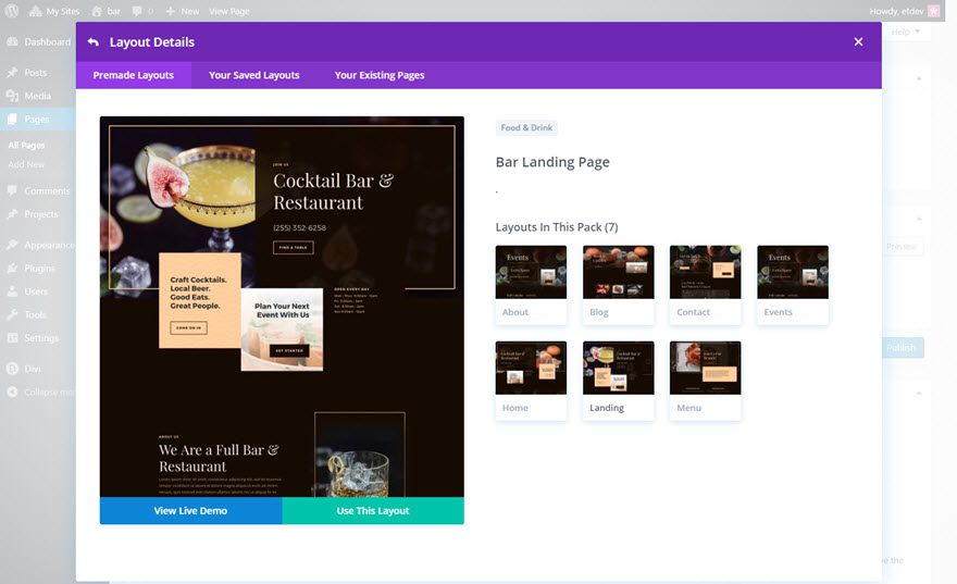 To access your new layout, simply activate the Visual Builder when editing a page and look for the “Load From Library” icon in the page settings bar (it looks like a plus symbol). Click this icon to launch the Load From Library popup. Under the Premade Layouts tab, you can easily find the new layout by scrolling through the list of layout packs. Once you find the Bar Layout Pack, click on it. You will see all the individual layouts included in the pack. Select the layout you want for to use and then click the “Use This Layout” button.