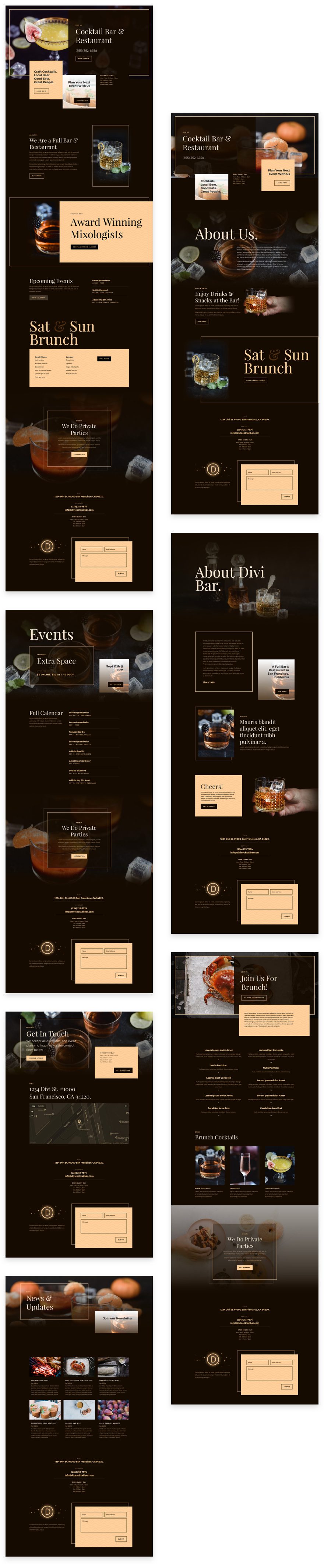 The Bar Layout Pack features sleek design elements that fit the bar niche perfectly, including custom icons and striking photos. The dark color scheme also gives off a feeling of refinement and warmth. The menu page and event page are useful assets as well.
