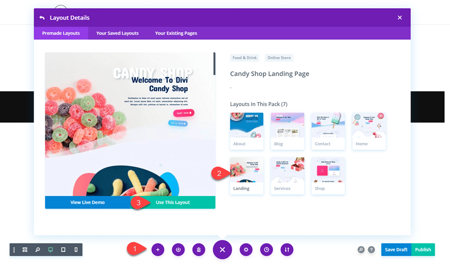 To access your new layout, simply activate the Visual Builder when editing a page and look for the “Load From Library” icon in the page settings bar (it looks like a plus symbol). Click this icon to launch the Load From Library popup. Under the Premade Layouts tab, you can easily find the new layout by scrolling through the list of layout packs. Once you find the Candy Shop Layout Pack, click on it. You will see all the individual layouts included in the pack. Select the layout you want for to use and then click the “Use This Layout” button.