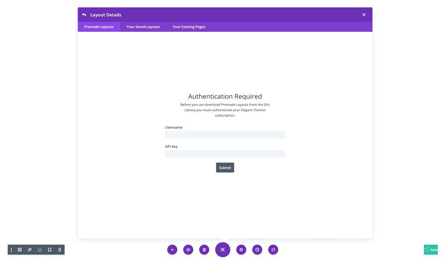 Before you can download Premade Layouts from the Divi Library you must authenticate your Elegant Themes Subscription. If you have already activated updates for Divi under Divi > Theme Options > Updates, you have already authenticated your subscription and will have access to the layouts without a problem. If not, when you click to import a layout to your page, you will be prompted to enter your Elegant Themes Membership Username and API Key.