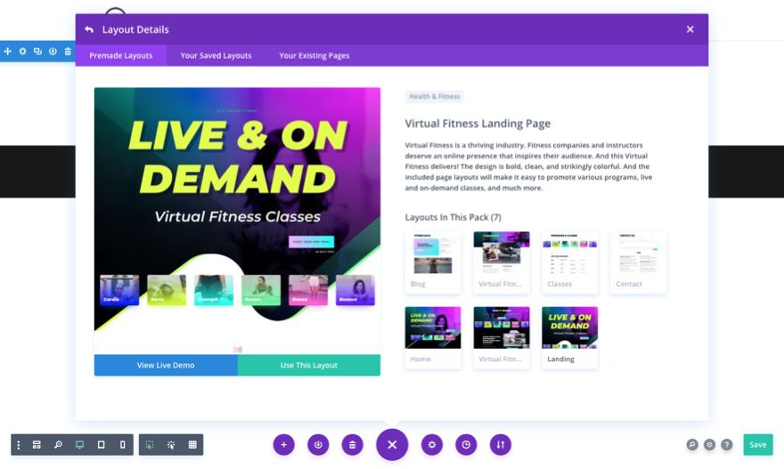 To access your new layout, simply activate the Visual Builder when editing a page and look for the “Load From Library” icon in the page settings bar (it looks like a plus symbol). Click this icon to launch the Load From Library popup. Under the Premade Layouts tab, you can easily find the new layout by scrolling through the list of layout packs. Once you find the Virtual Fitness Layout Pack, click on it. You will see all the individual layouts included in the pack. Select the layout you want to use and then click the “Use This Layout” button.