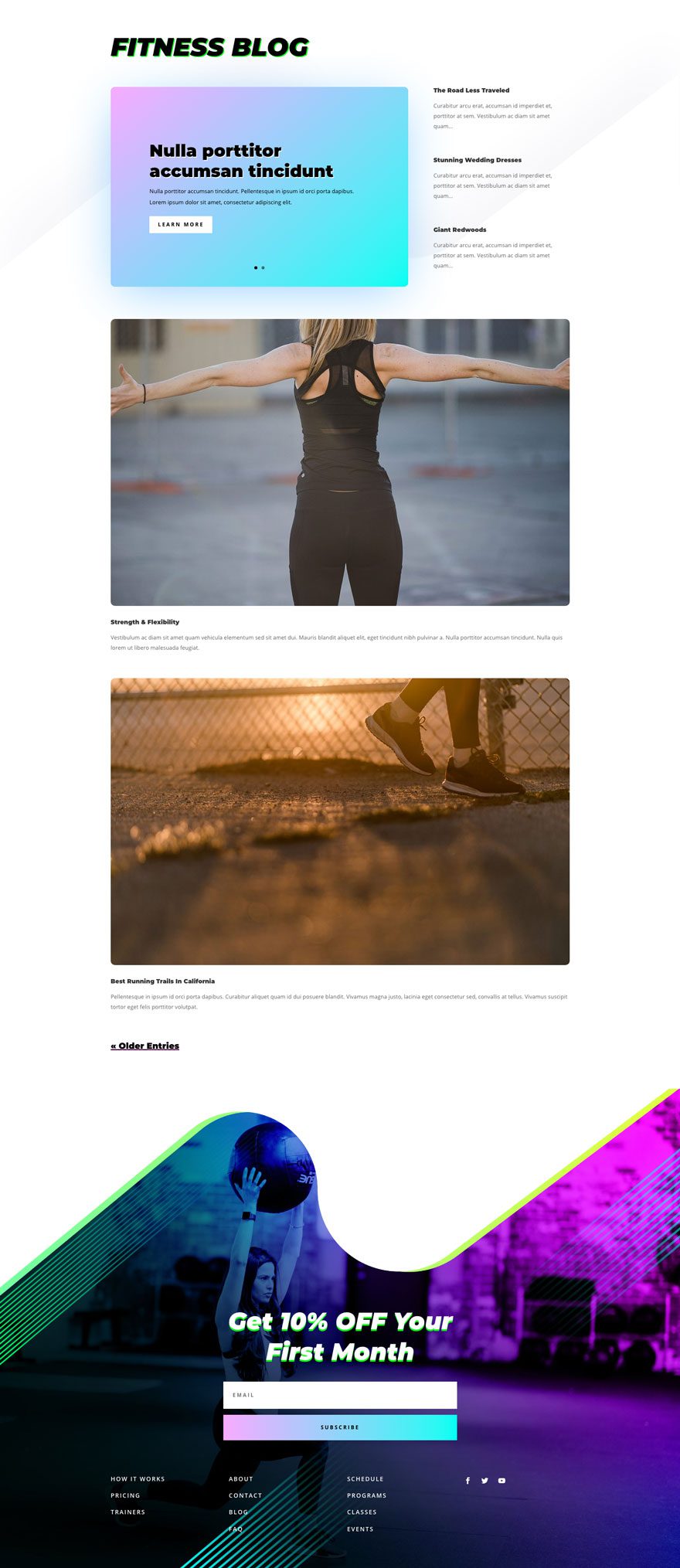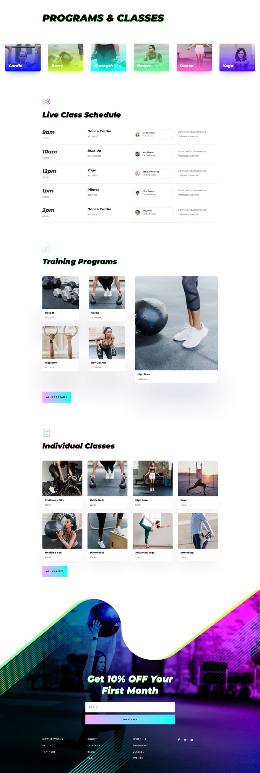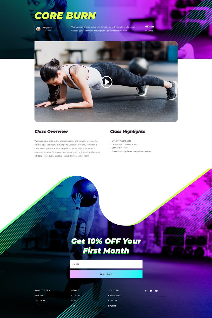 This pack features page layouts with bold fonts and striking color schemes to make the content pop. The colorful custom icons are also a great addition. The pack also includes dedicated layouts for showcasing classes and a unique “How It Works” page. Plus, the image assets provided, offer some great PSD mockups for customizing images to fit your site perfectly.