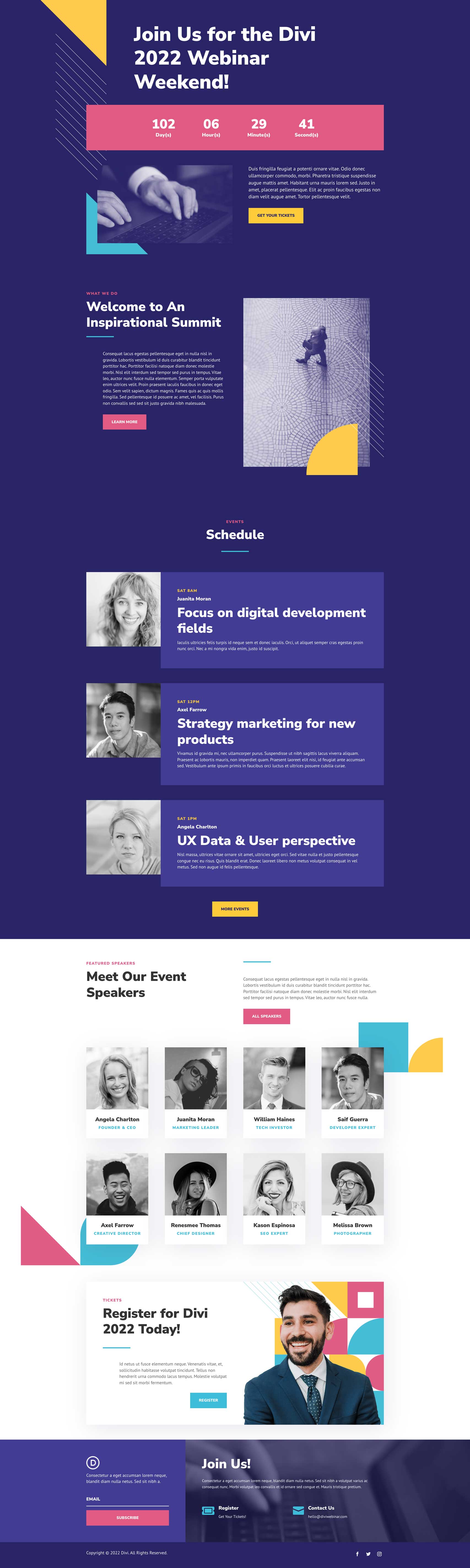 – 8 Premade page layouts strategically designed for any webinar website (including a footer design)