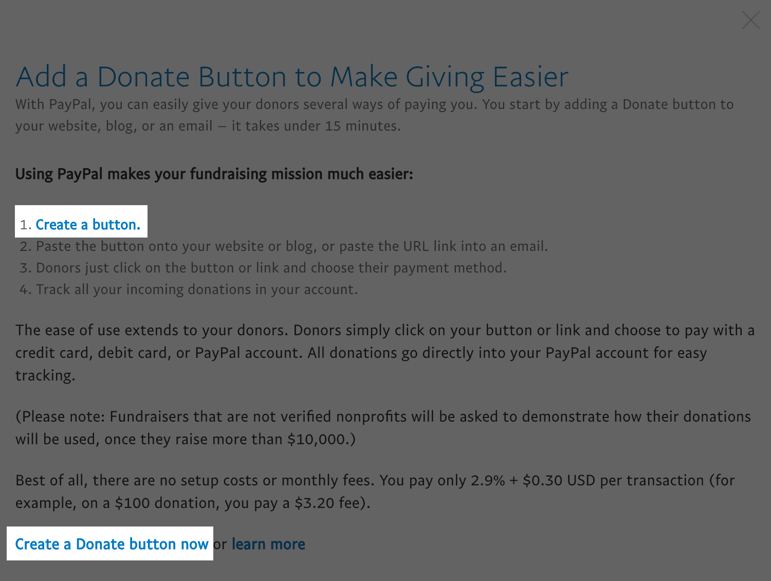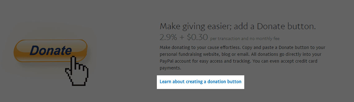 On the next page, scroll down until you see the text “Learn about creating a donation button” and click it.
