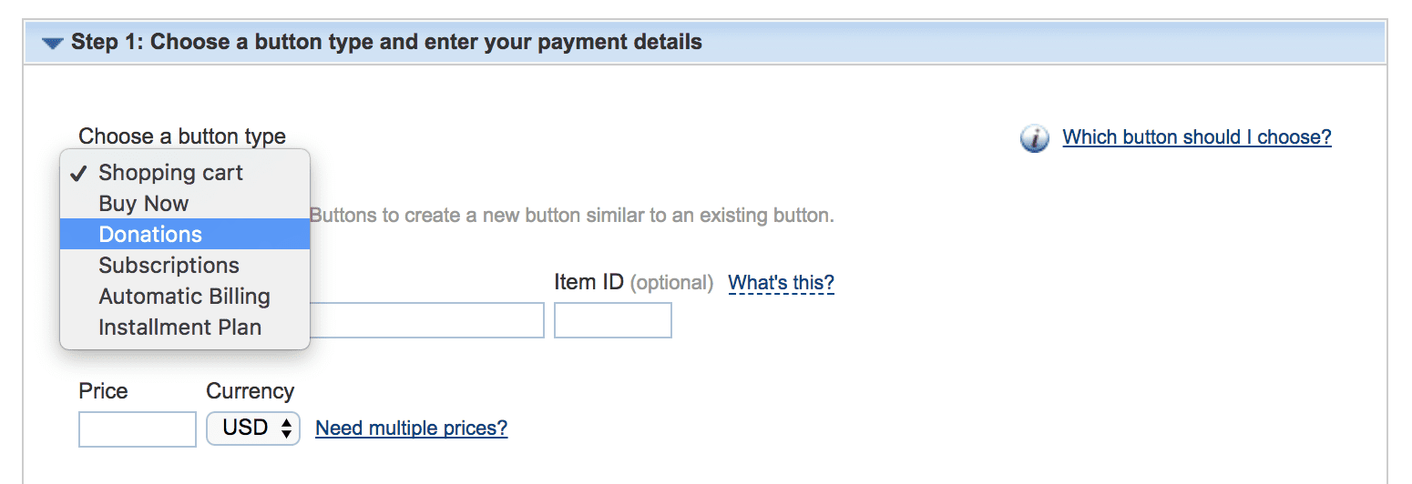 The first thing you’ll do to create the Paypal donate button is actually make it a “donate” button. The default setting is “Shopping Cart,” but if you click the dropdown in the upper left of Step 1, you can change it to “Donations.” Like I said, pretty straightforward, huh?