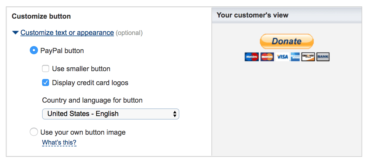 After you put in your info, you get to start customizing your button. For the most part, there’s not a lot you will want to change. It’s all pretty basic stuff such as selecting which country and language the button will use, the size, and whether or not you will display credit card logos. All of these choices are based on how you intend on integrating the button on your site.