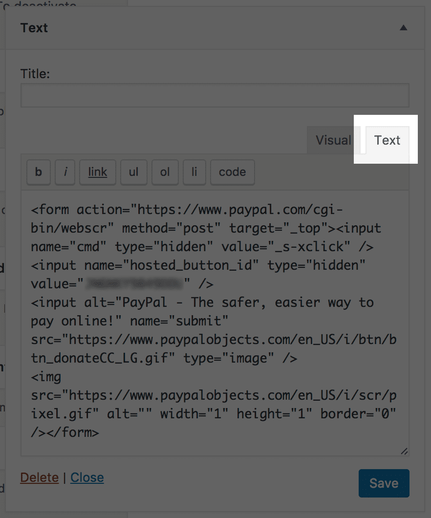 Make sure that you means we need to click on the “text” tab before pasting your donate button code in here. (There is no need to use the code button, either.)