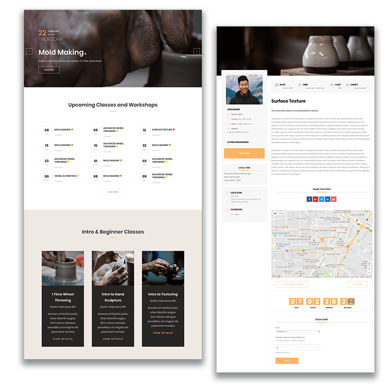 Now you have a slider that showcases your workshop and class events as well as a grid layout of the same events. Users can click on any of this events and they will be taken to the single event page where they can see event information and register for the event.