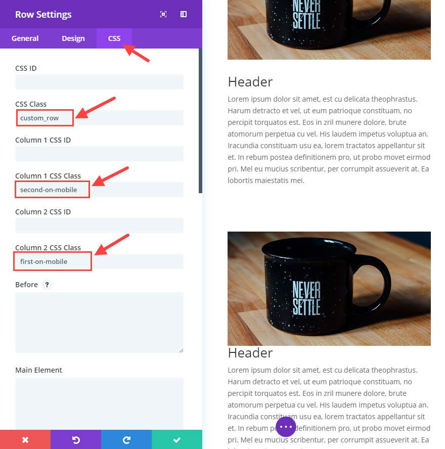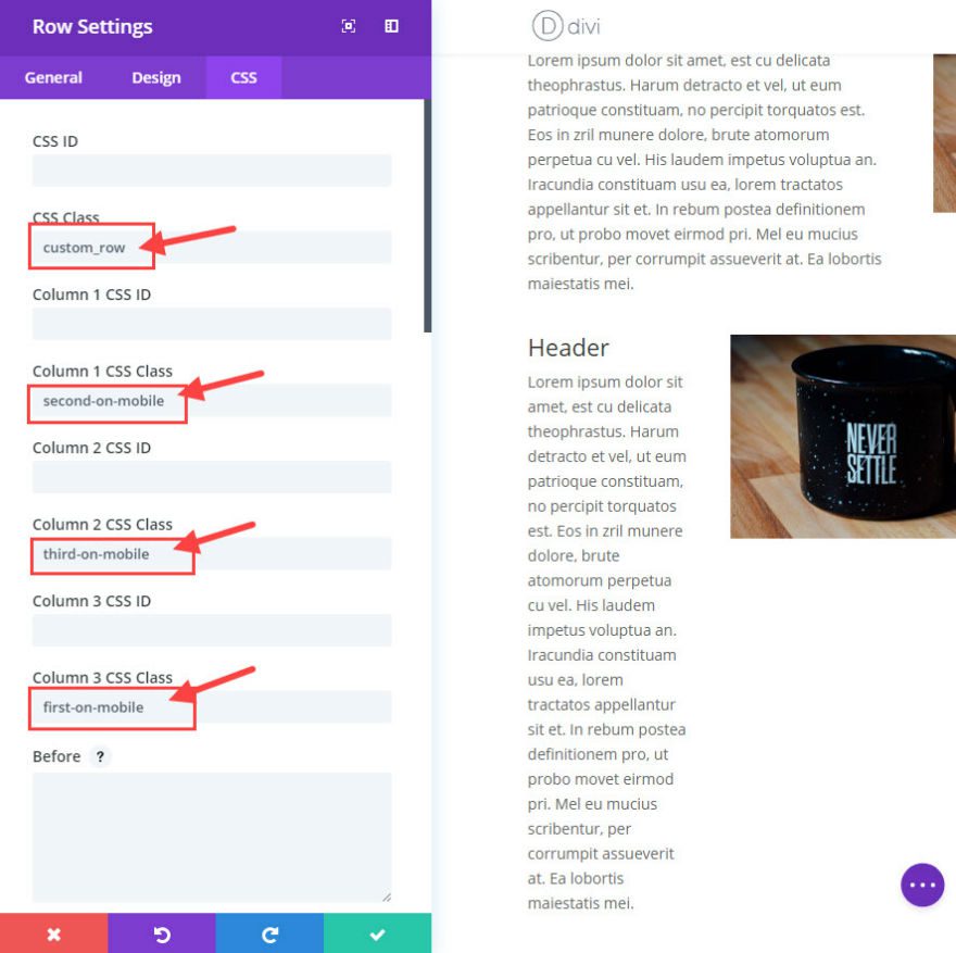 Just follow the same steps you did before. In your row settings, under the CSS tab, add a the class “custom_row” to the row and add your ordering class (“first-on-mobile”, “second-on-mobile”, “third-on-mobile”) to each of your columns. Remember to make sure you add a class to each of your columns so they all have a designated order value.