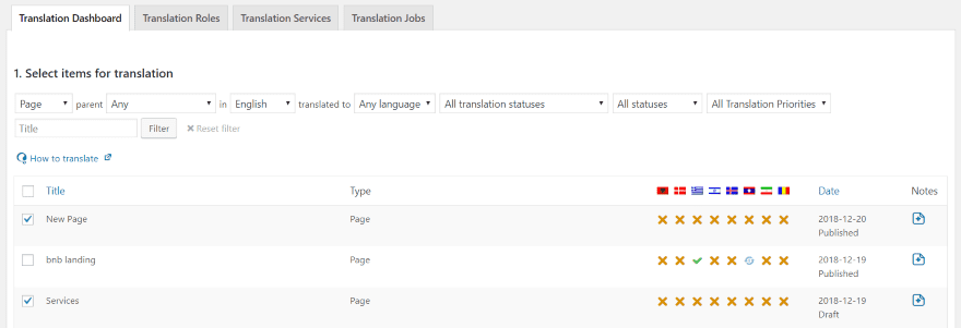 The Translation Management screen will now provide a list of items to translation. You can also adjust roles, services, and translation jobs using the tabs.