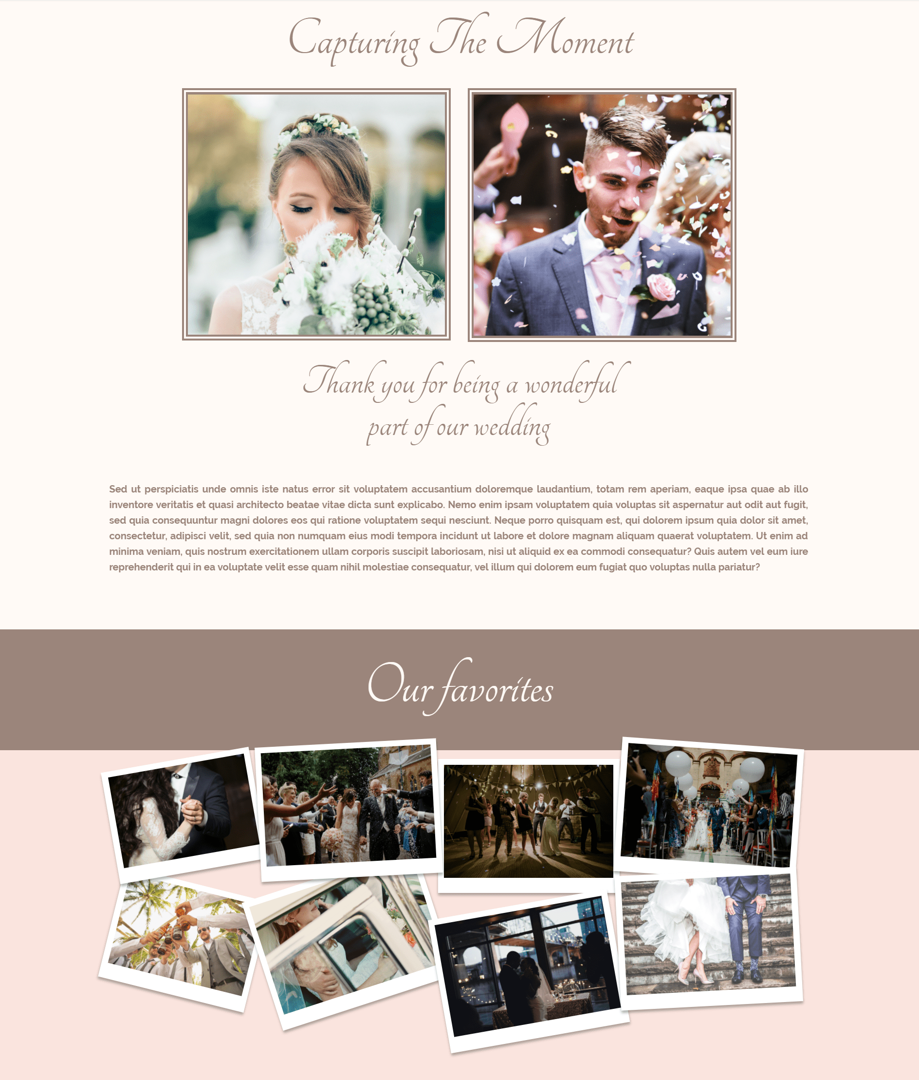 After you’ve finished the thank you note section, you can go over to the section where you show the favorite pictures of the bride and groom. In this part, you’ll be using two sections and apply CSS code to the image modules to make them look polaroid.