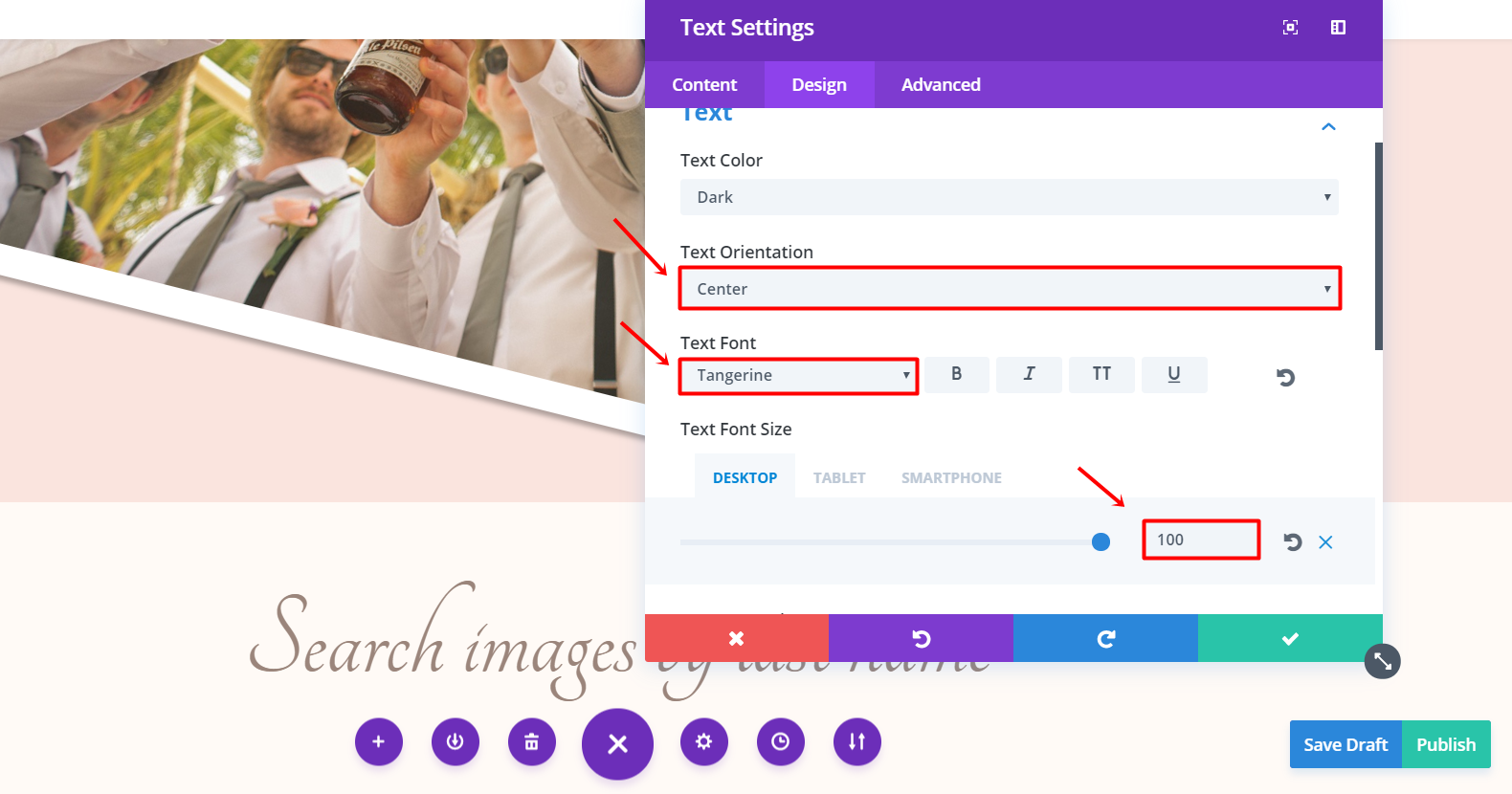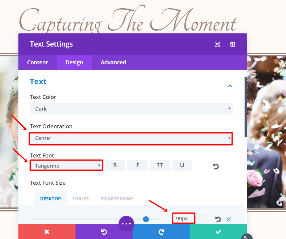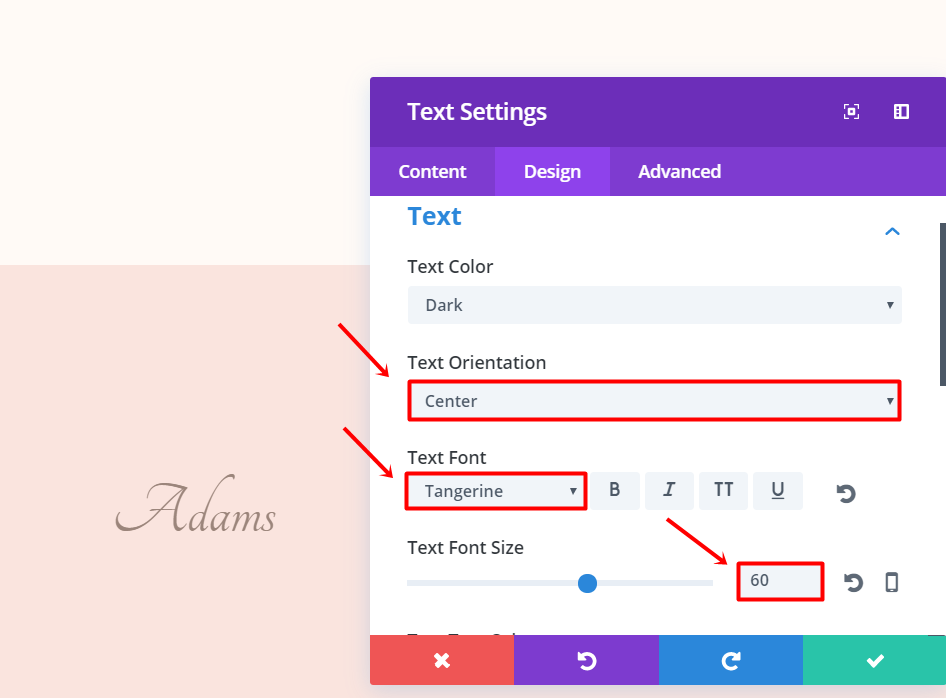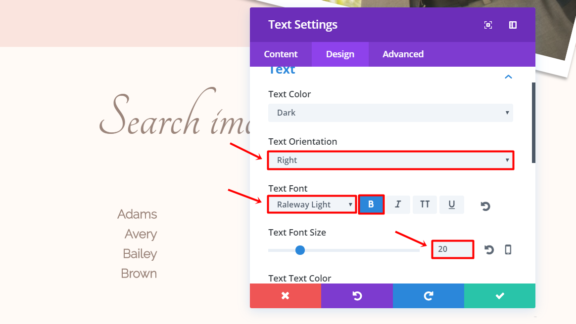 Now, add a Text Module and type down the last name of a family in the text box within the Text subcategory of the Content tab. Continue by going to the Design tab and making the following changes: