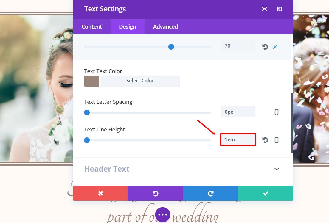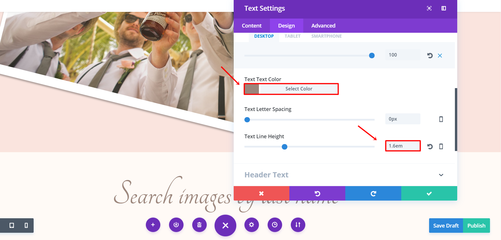 Next, add a text module to the row. Open the settings and enter the title you’d like to show in the text box of the Text subcategory. Moving on, go to the Design tab and make the following changes in the Text subcategory: