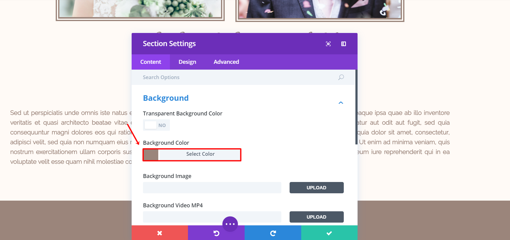 Start by adding a standard section. Within that standard section, you’ll be needing a fullwidth row. Open the section settings and change the background color to ‘#9b857b’ in the Background subcategory of the content tab.