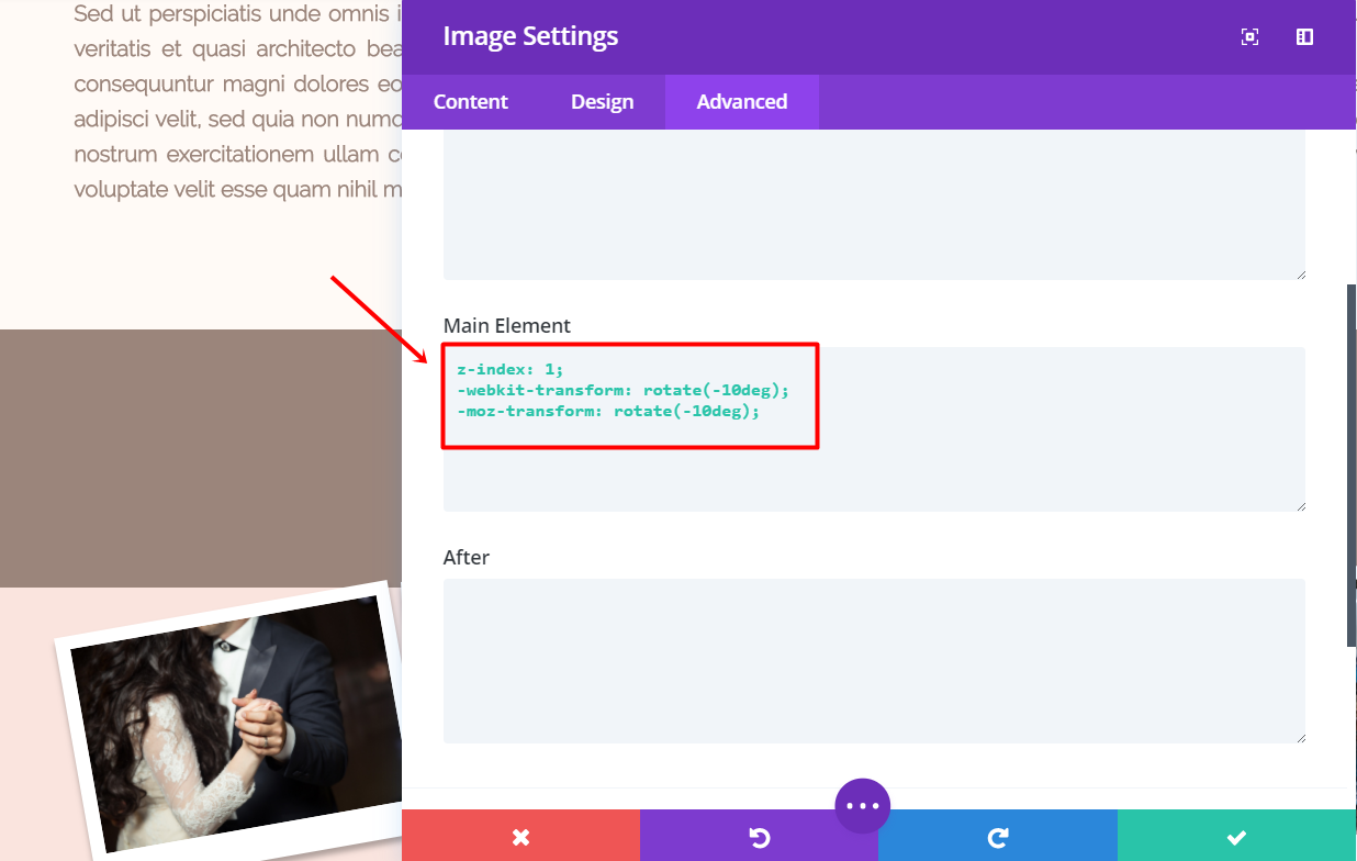 Next, go to the Advanced tab, click on the CSS ID & Classes subcategory and type down ‘polaroid’ in the CSS Class field. In the Main Element field, add the following code: