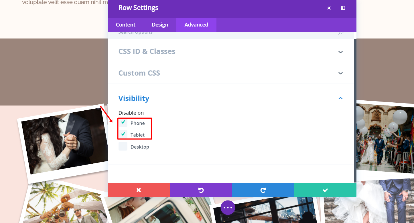 Now, go to the Advanced tab of this row and hide it for tablets and phones within the Visibility subcategory.