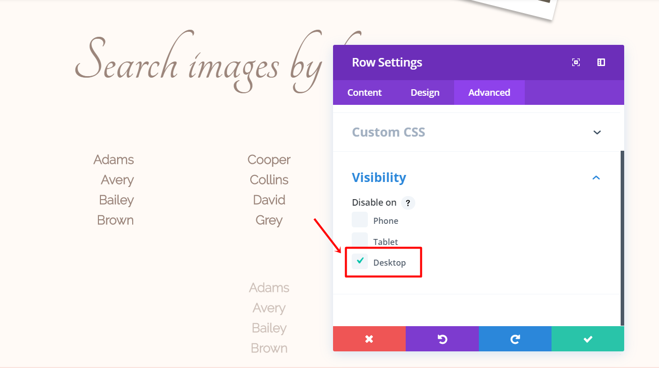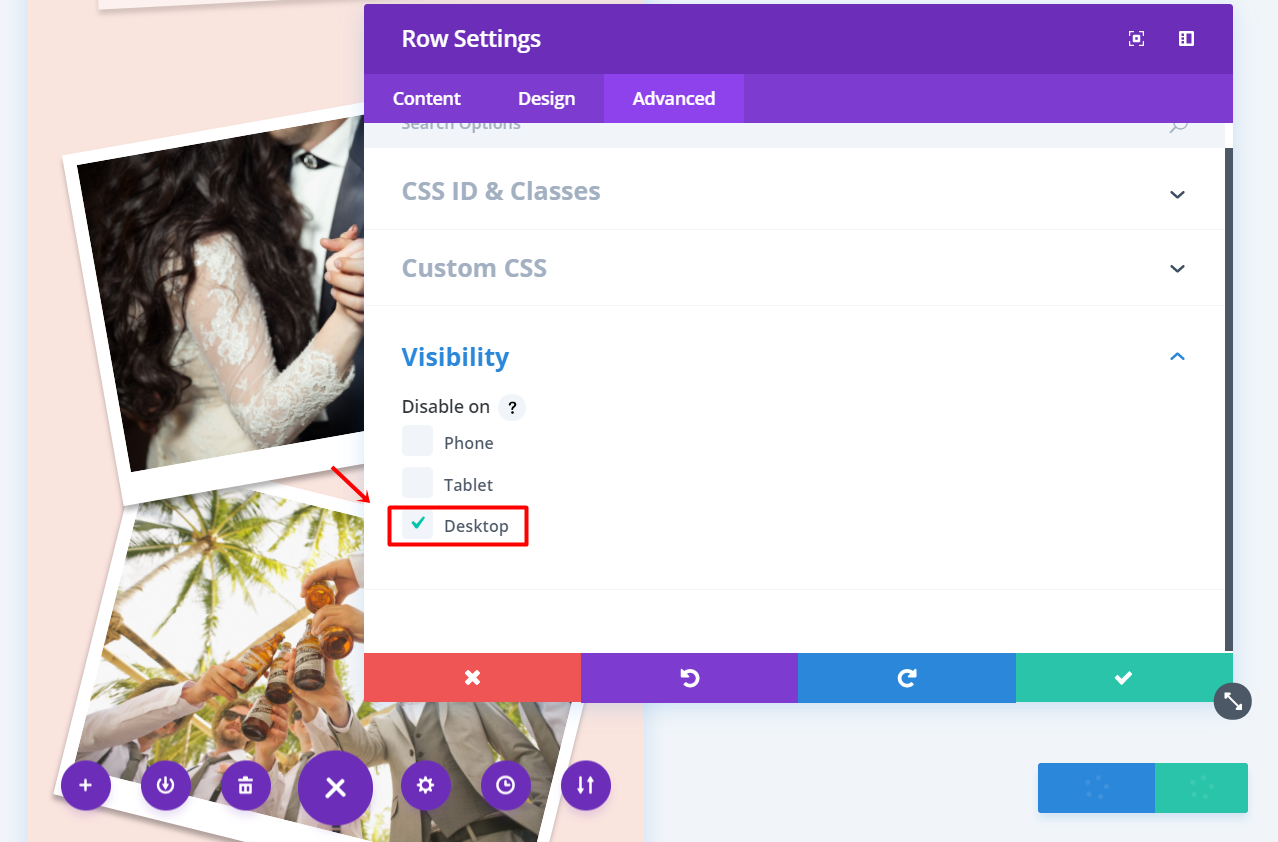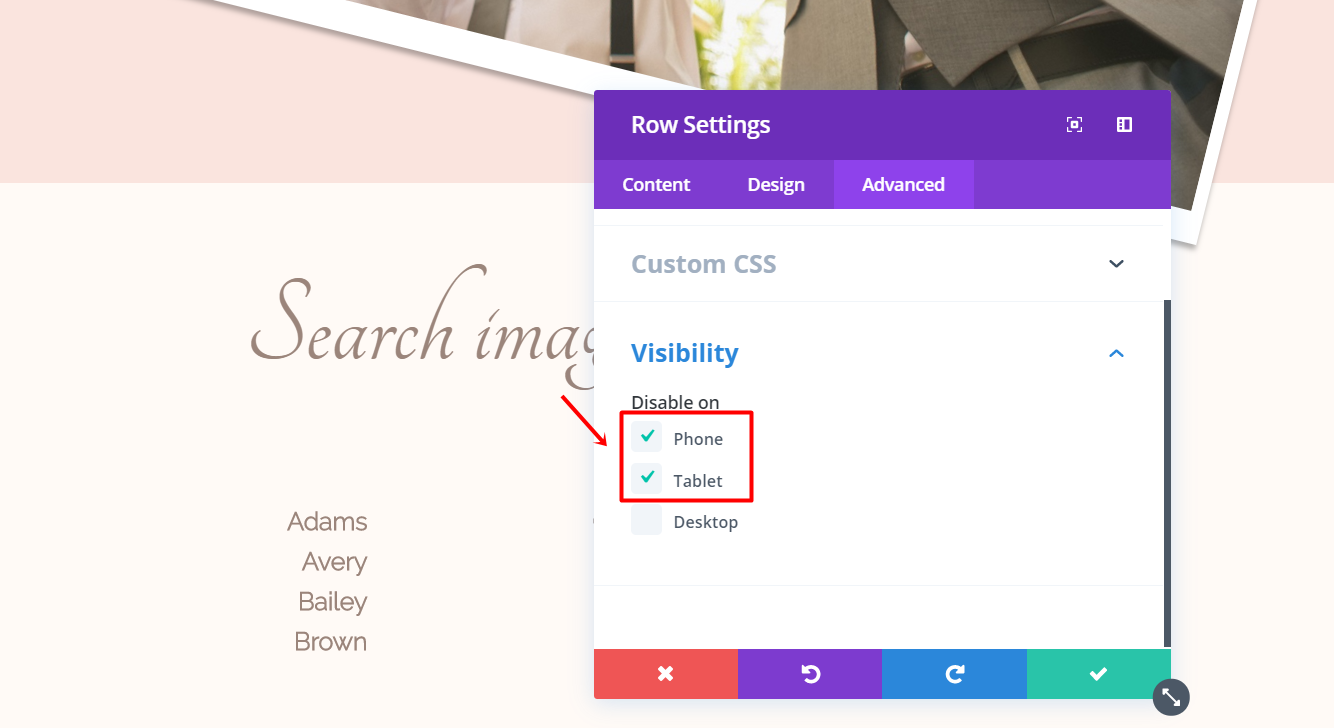 After having set up all the images, open the settings of the row. Go to the Advanced tab and hide the row for phone & tablet within the Visibility subcategory.