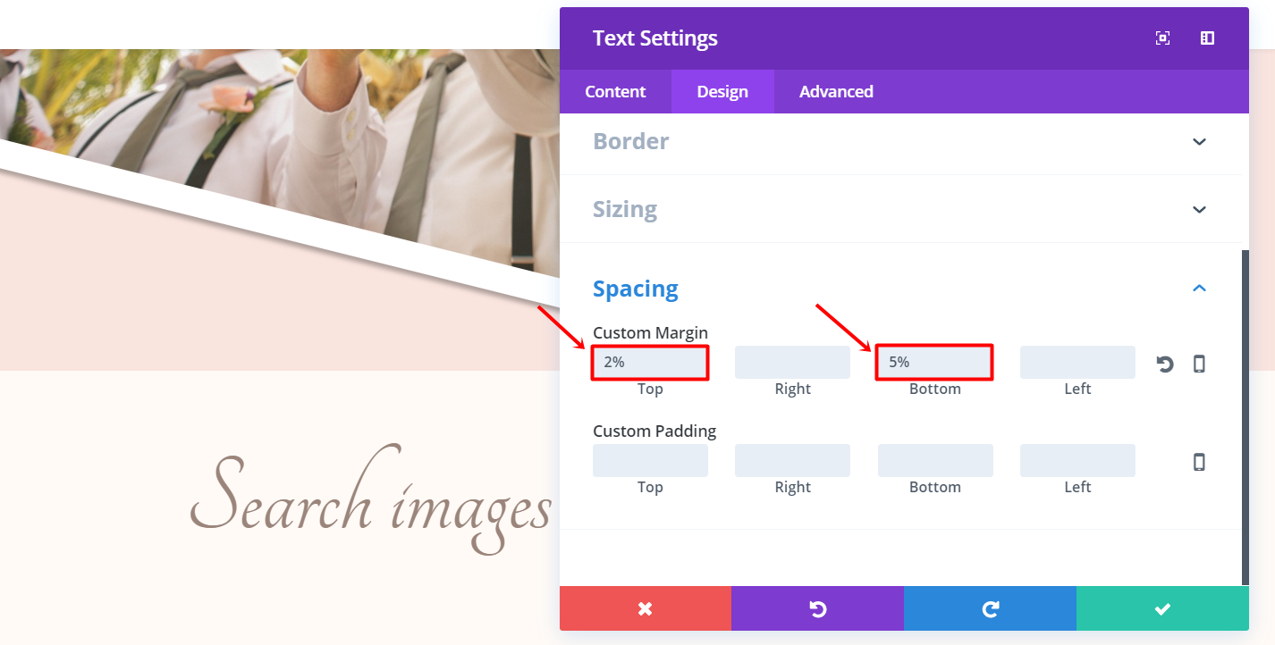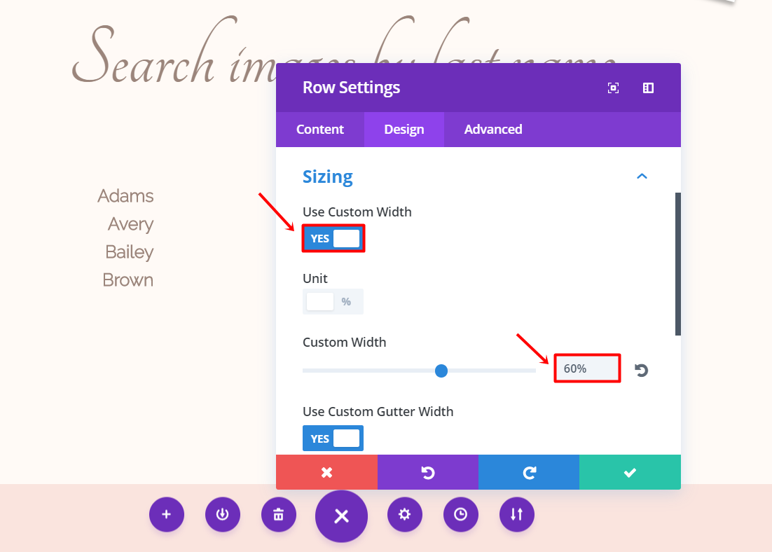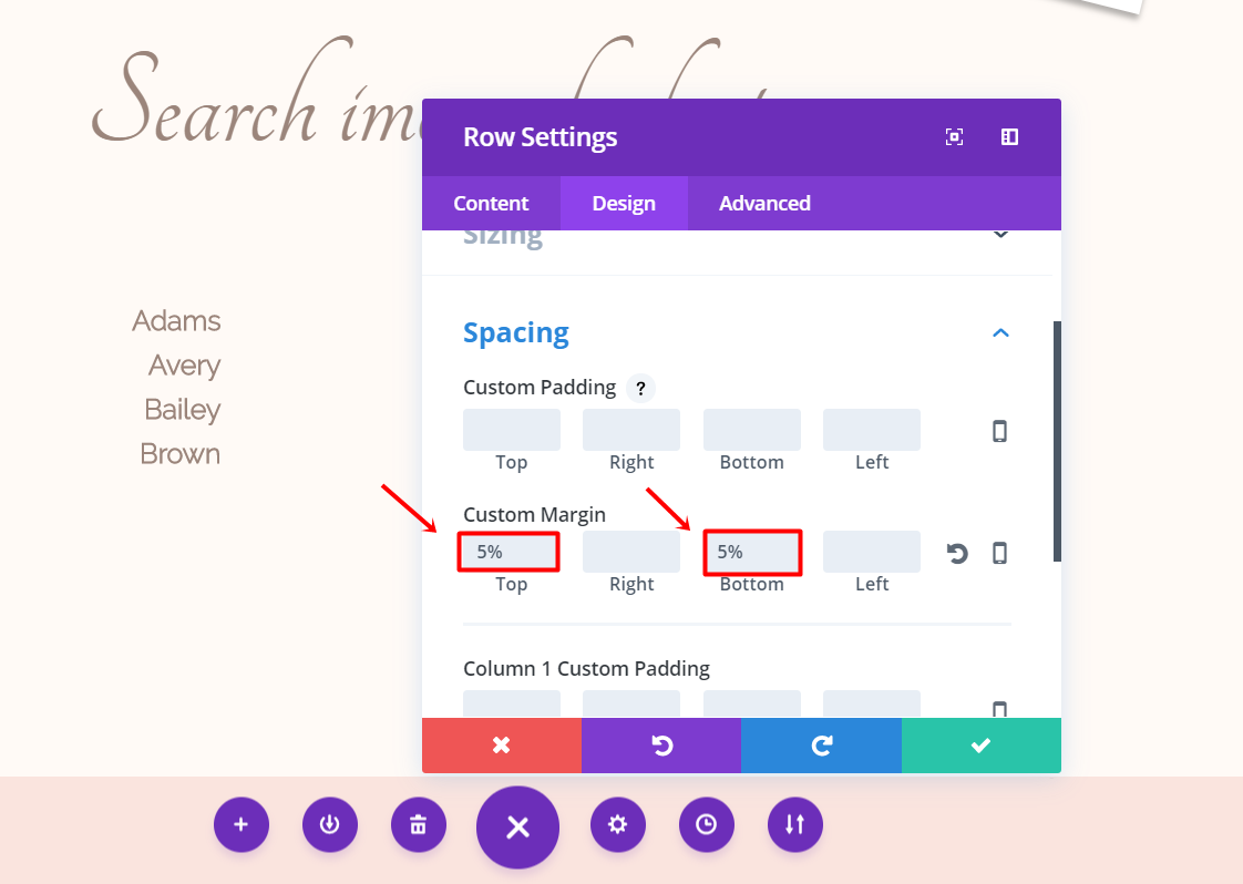 Next, go to the Design tab of the row settings and open the Sizing subcategory. Activate the Custom Width option and change the percentage to ‘60%’. Scroll down the same tab and add ‘5%’ to the bottom margin.