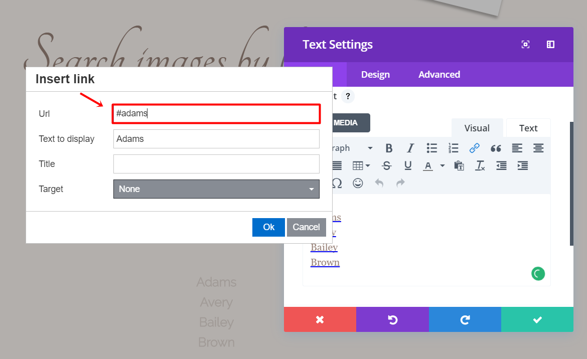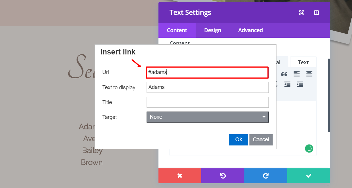 Next, add a text module to the left column of the row. Within the text module, add one-third of the guests’ last names. Each of these last names will need an anchor link to the part of the website you want to bring them to. Select one of the names, click on the link icon and write a ‘#’ + the name. Later on this blog post, you’ll link this name to a certain section. Repeat the same thing for each one of the names on the list.