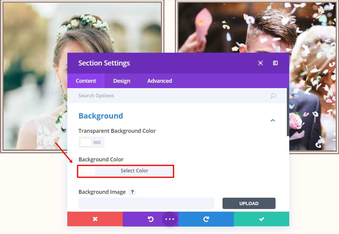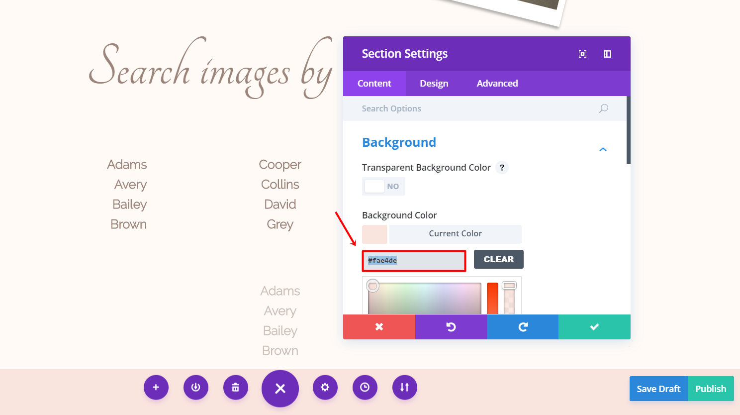 Open the settings of the section you just created and open the Background subcategory in the content tab. Then, change the background color to ‘#fffaf6’.