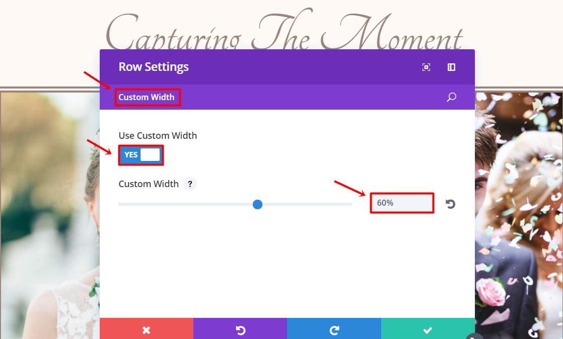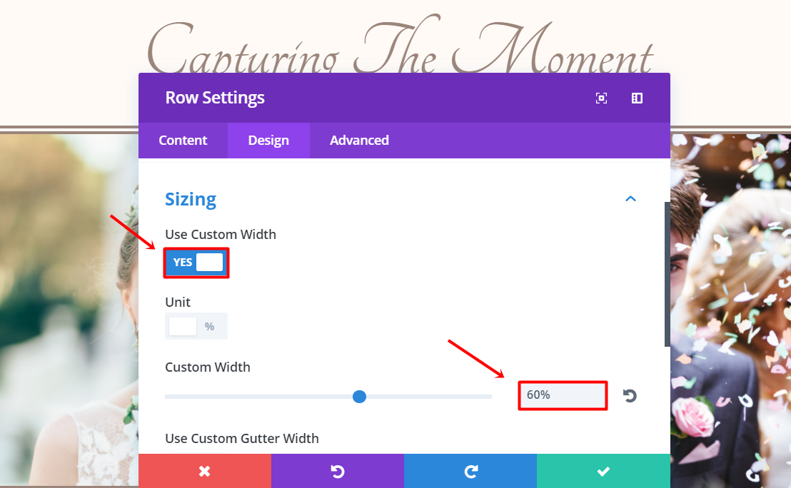 Within the row sections, use Custom Width. Go to the Design tab Select and change the Custom Width to ‘60%’ within the Sizing subcategory.