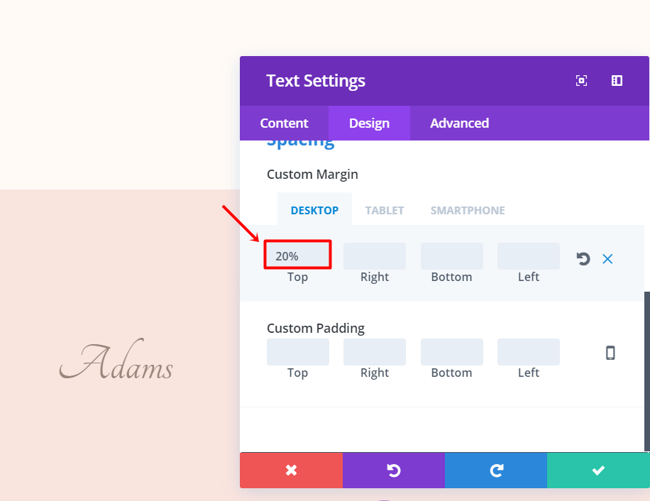 Scroll down the same tab and change the top margin to ‘20%’ within the Spacing subcategory.
