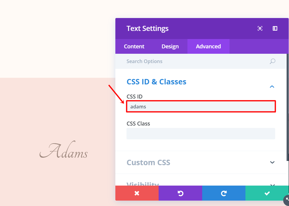 Move on to the Advanced tab. In the CSS ID field of the CSS ID & Classes subcategory, you’ll have to link the anchor link you’ve made above to the Text Module. So, if the first anchor link in the list was ‘#adams’, then you’ll have to fill in ‘adams’. Make sure the ID is the same as the one you linked to the name in the list you’ve made before.