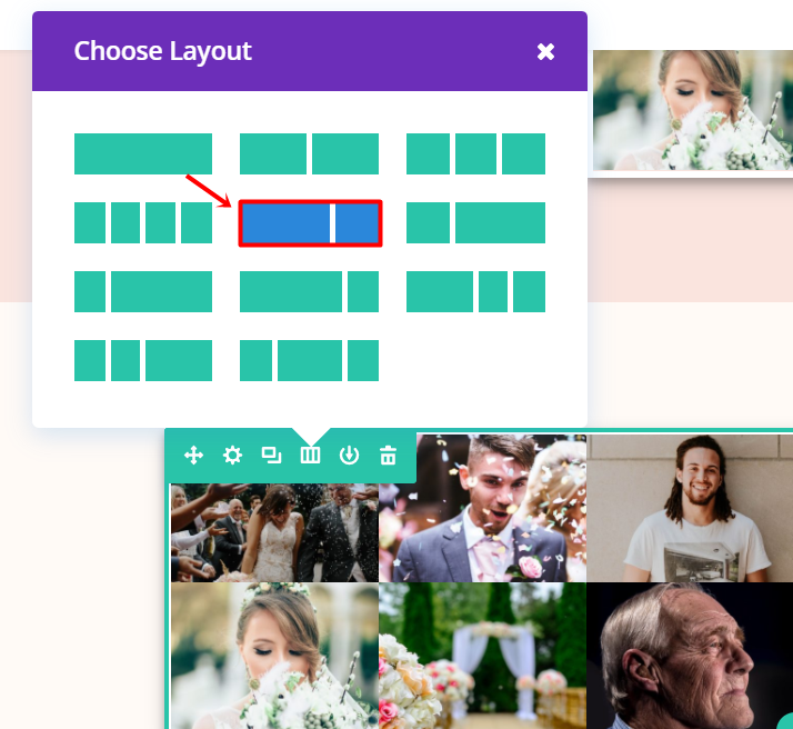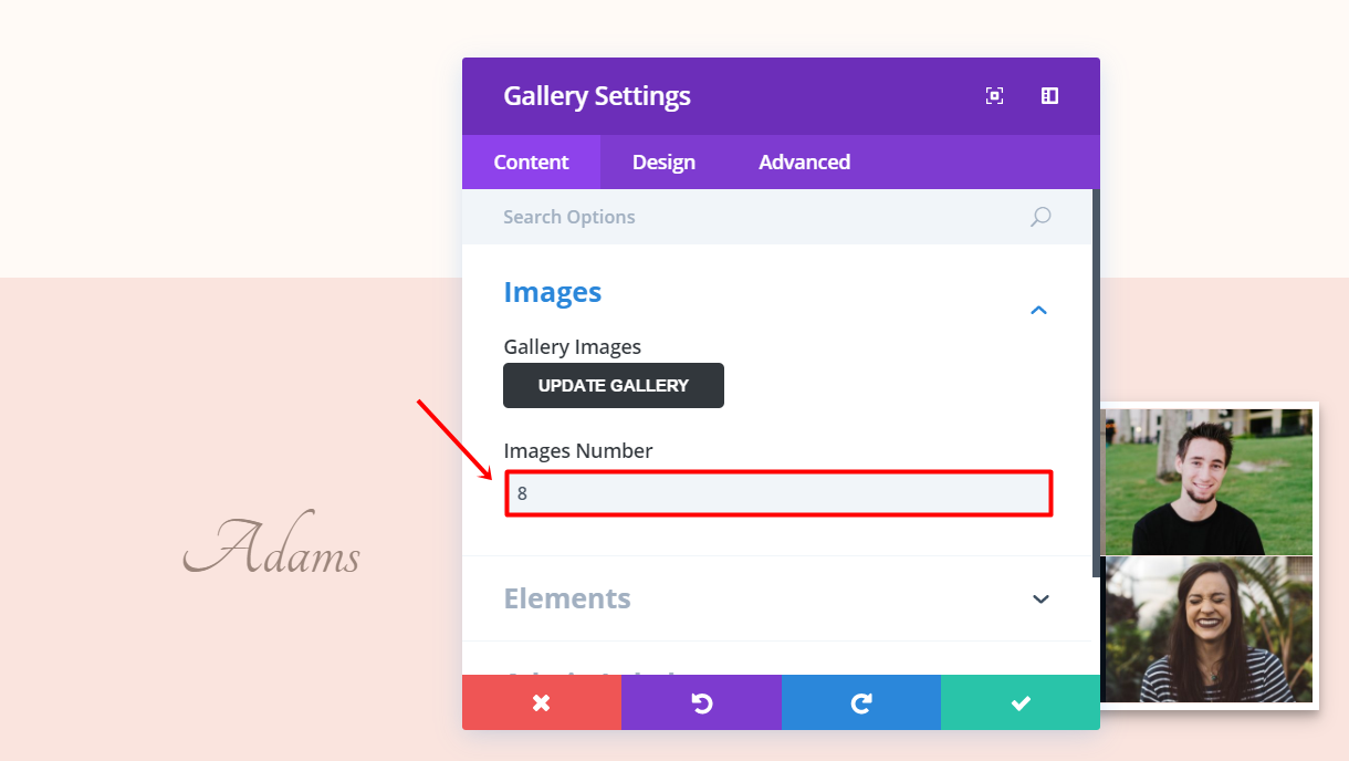 In the second column of the row, you’ll have to add a Gallery Module. Type down ‘8’ in Images Number field in the Images subcategory of the General tab and choose 8 images.