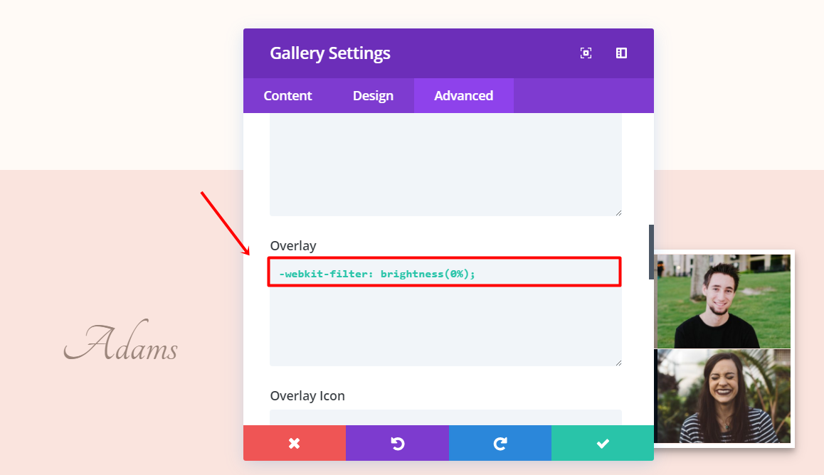 Moving on, go the Advanced tab. In this tab, you’ll have to add code to two different sections of the Custom CSS subcategory; the Main Element and Overlay.
