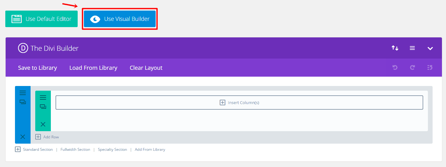 Start by creating a page, using the Divi builder and switch over to Visual Builder.