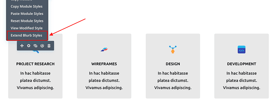 Once you’ve changed these settings on one blurb, you can right click on the module and use the “Extend Styles” to apply them to the other three.