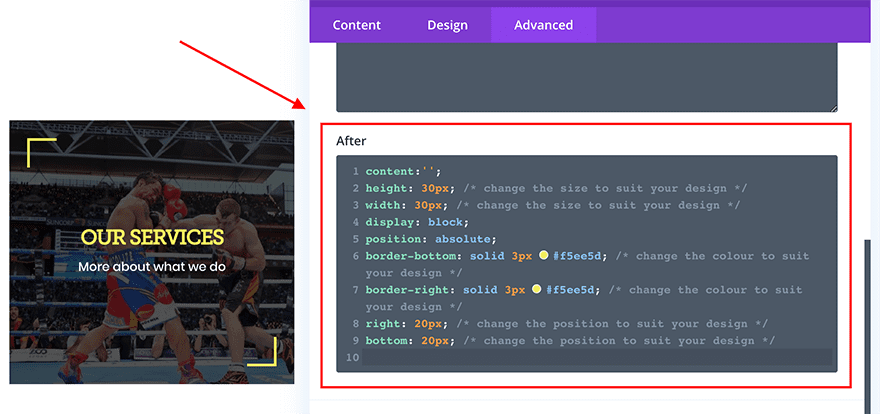 Once you’ve done this, open up the module options and navigate to the “Advanced Tab”. Within the “before” box, add this CSS snippet: