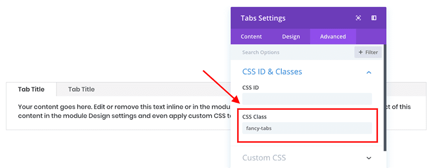 Open up the tabs module options and within the Advanced tab give the module the class “fancy-tabs”.