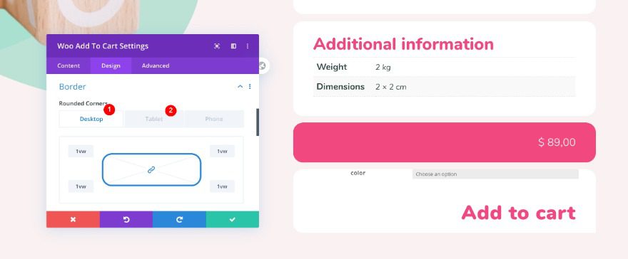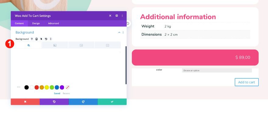 * When you add a woo add to cart module, you’ll notice that on the top it has a dropdown menu for a color option. If you didn’t specify this on your product page, it will not show up in your final design. You can make sure by checking the live product as you’re building inside the theme builder.