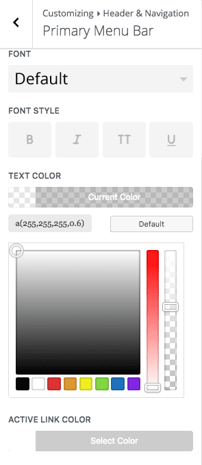 - I’m using rgba(255,255,255,0.6) as my link color and solid white as my active link color (I just like the visual effect that gives)