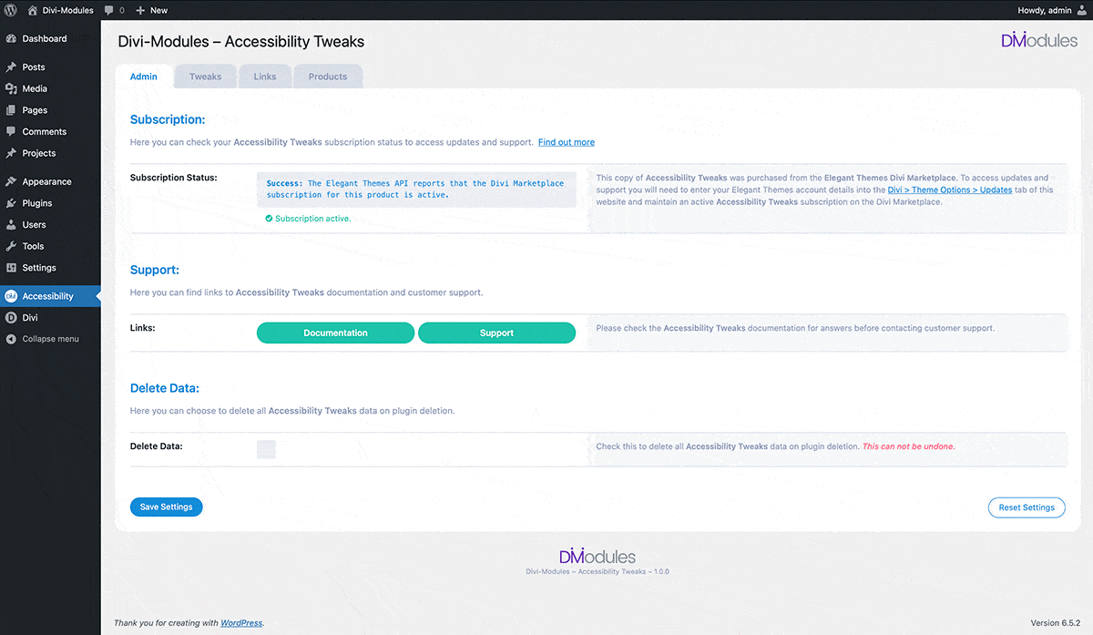Once the plugin is active on your Divi site,Β theΒ AccessibilityΒ tab will be added to your WordPress sidebar. Click on it to access your dashboard, whichΒ has four tabs: Admin, Modules, Elements, and Products.