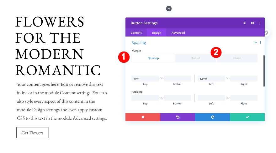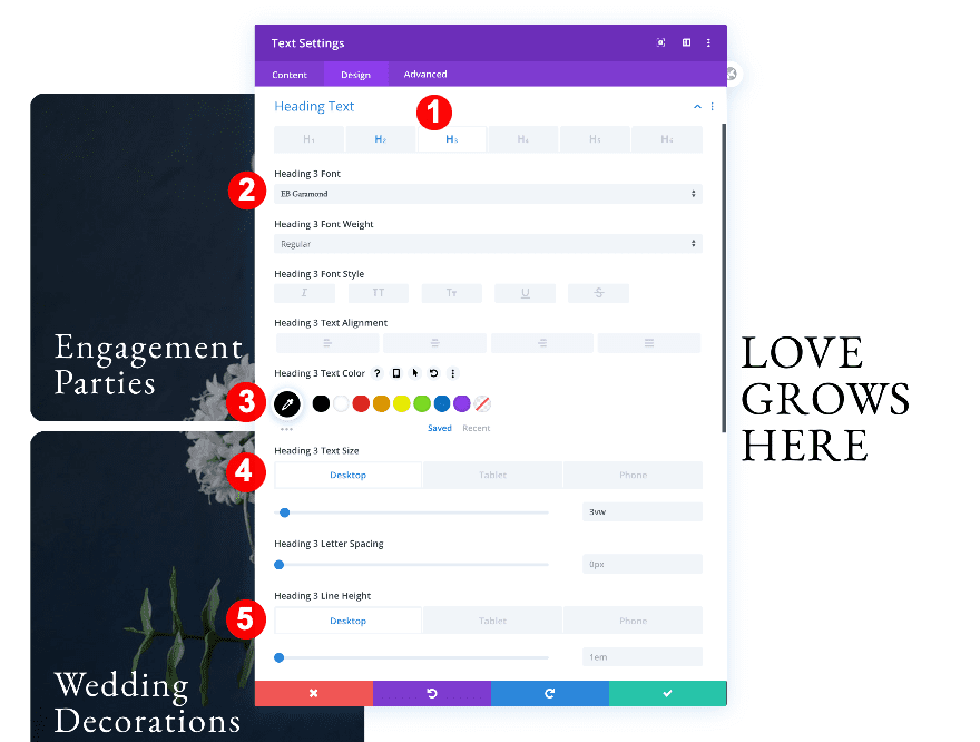 Move on to the design tab and change the H2 text settings accordingly: