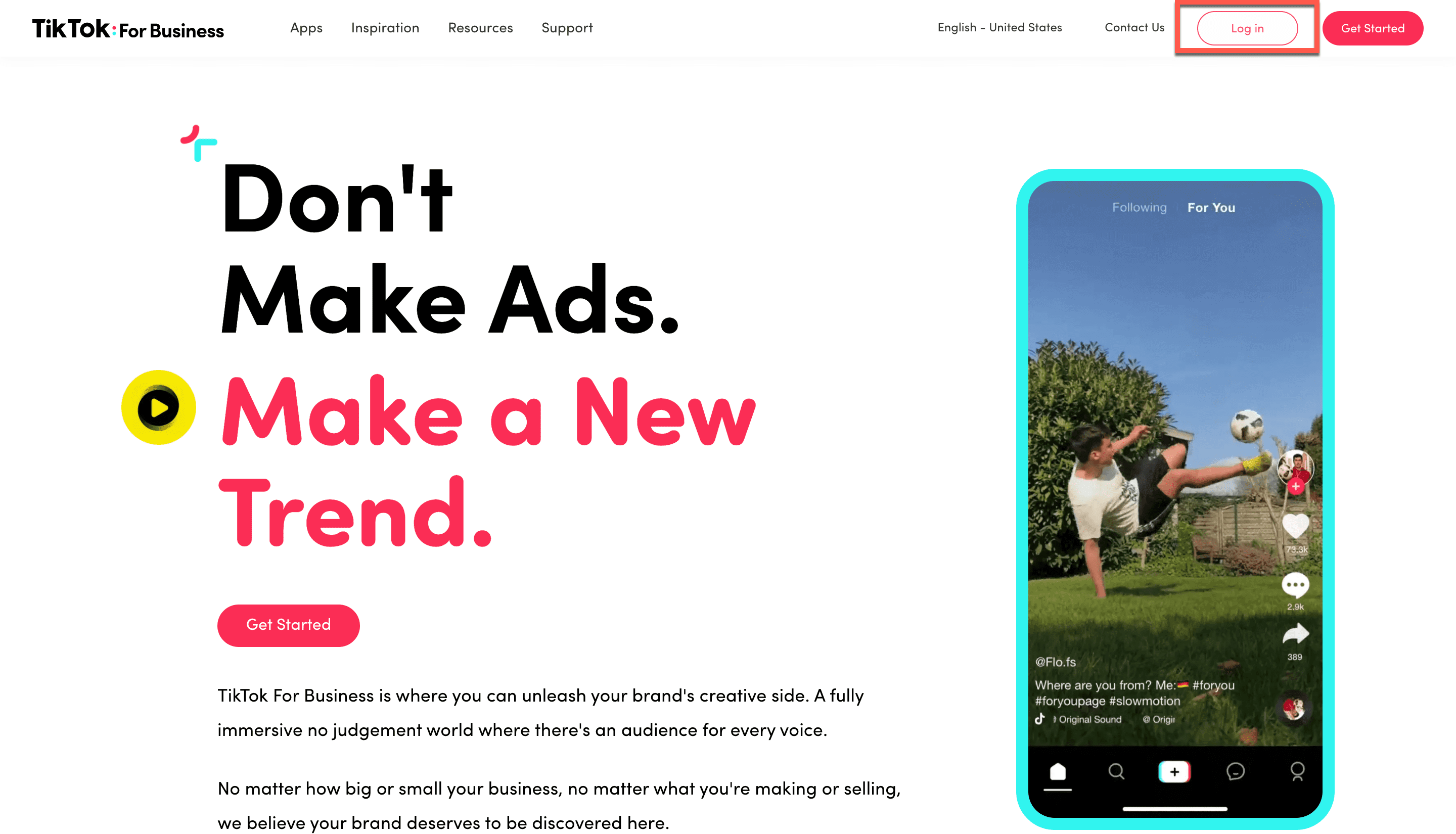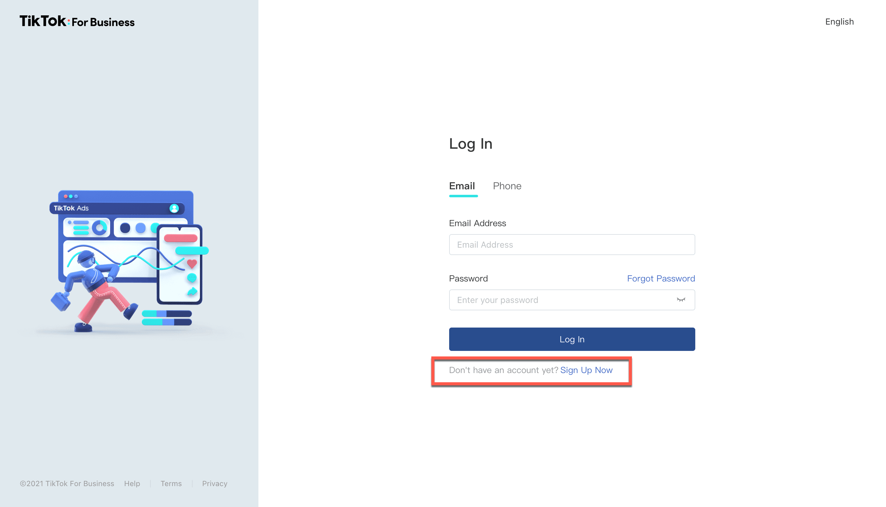 1. On the TikTok Ads homepage, click Log In. Enter your credentials to access your account.