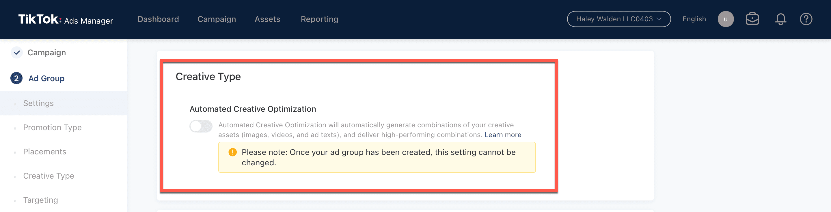 13. Select your creative type. This step features a button you can toggle to turn on Automated Creative Optimization.