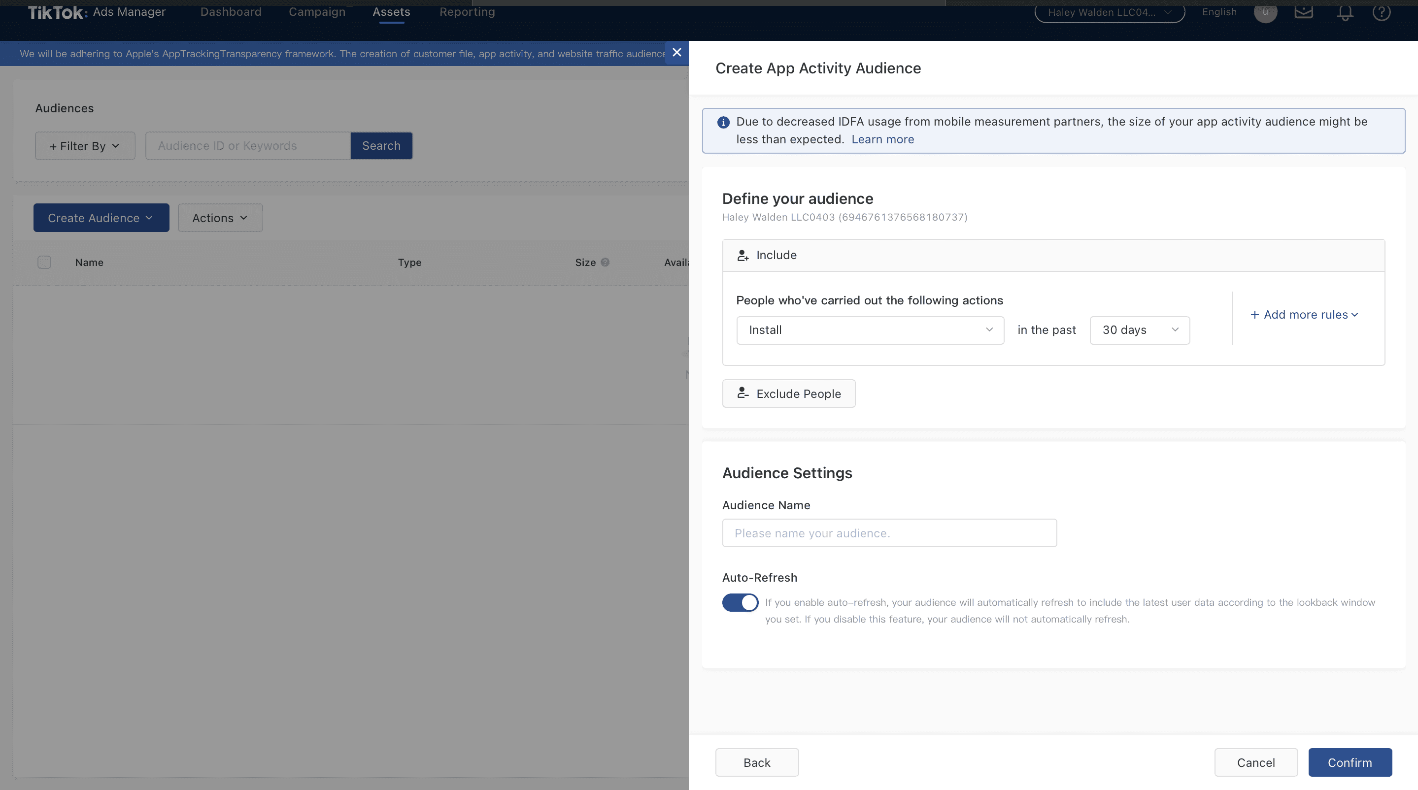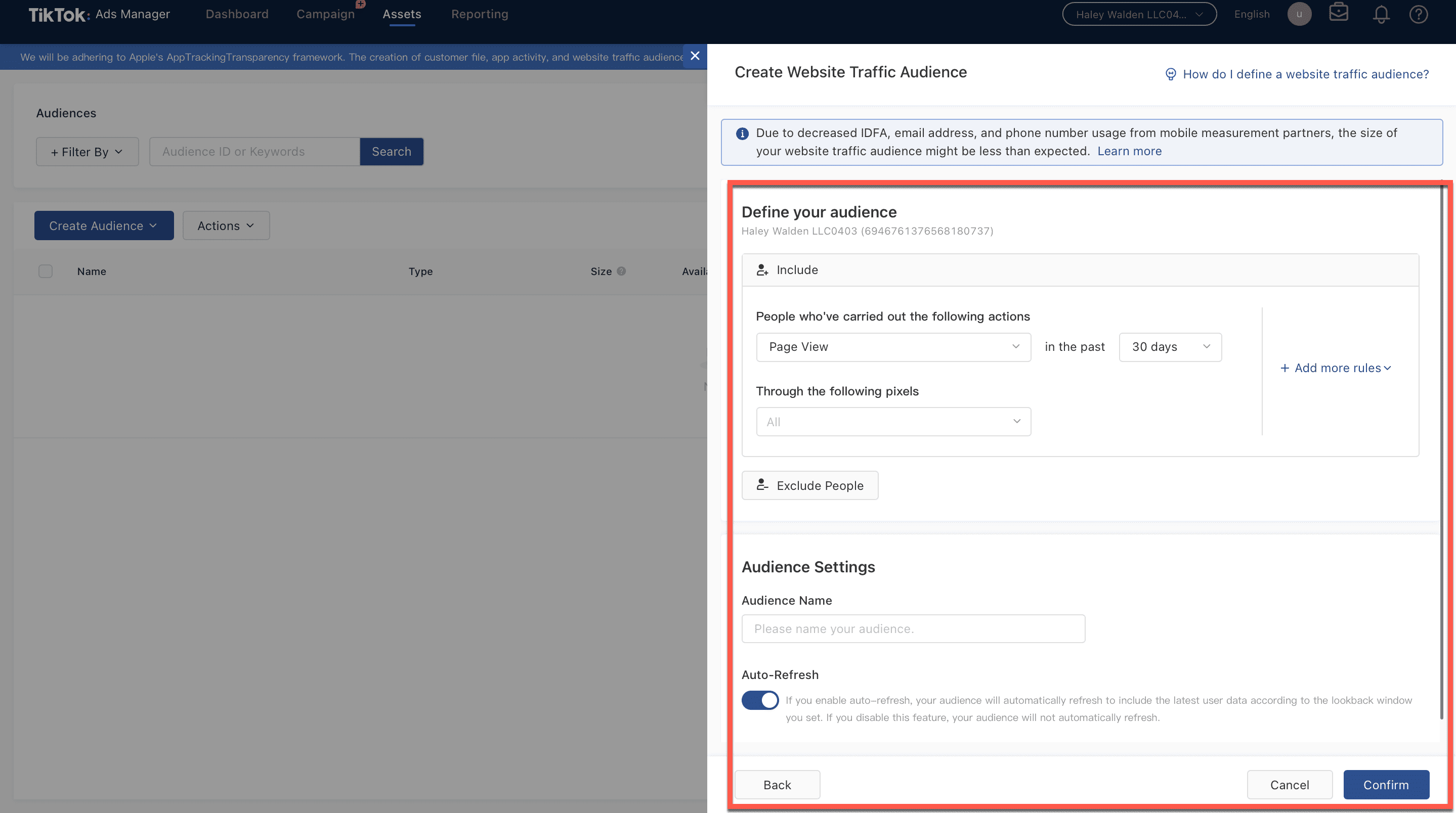 15. If you haven’t already created an audience that you can include, then TikTok Ads Manager will take you to a separate window where you can create your audience.