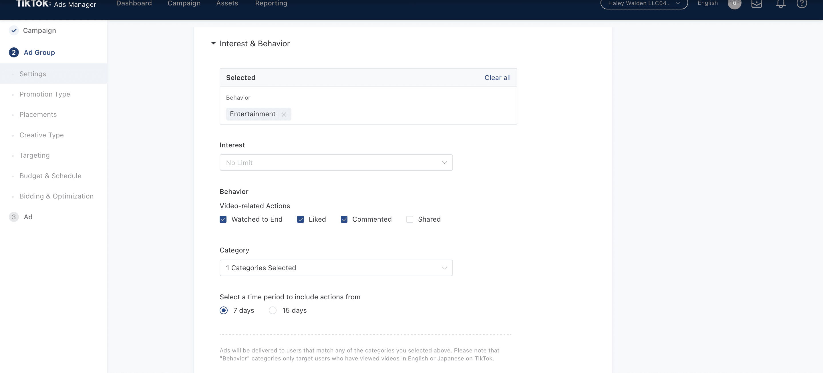 17. Now, it’s time to fill out the rest of your demographic information. In addition to basic demographics, such as age and location, you’ll also have the option to filter by behavior. For example, you can select a category of interest, such as Entertainment, then filter by viewers who watched your video in full, then engaged with it.