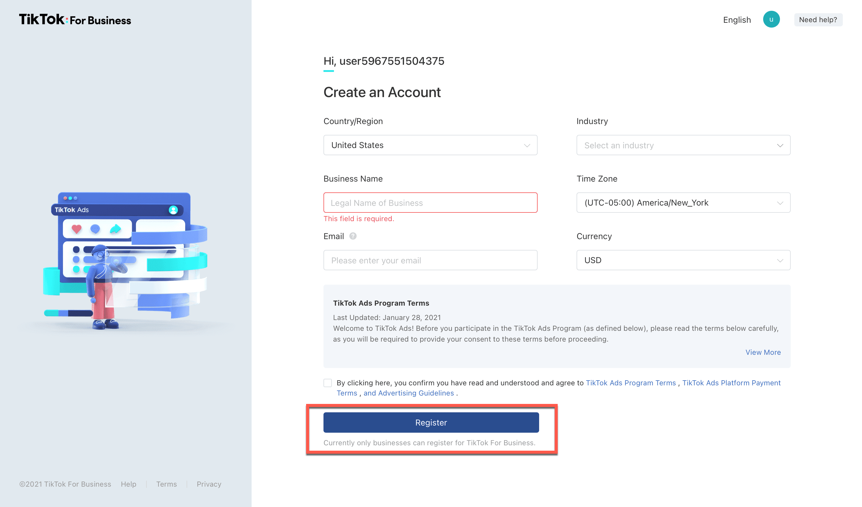 2. Next, fill out your account credentials to get signed up. Click Register when you’re ready.