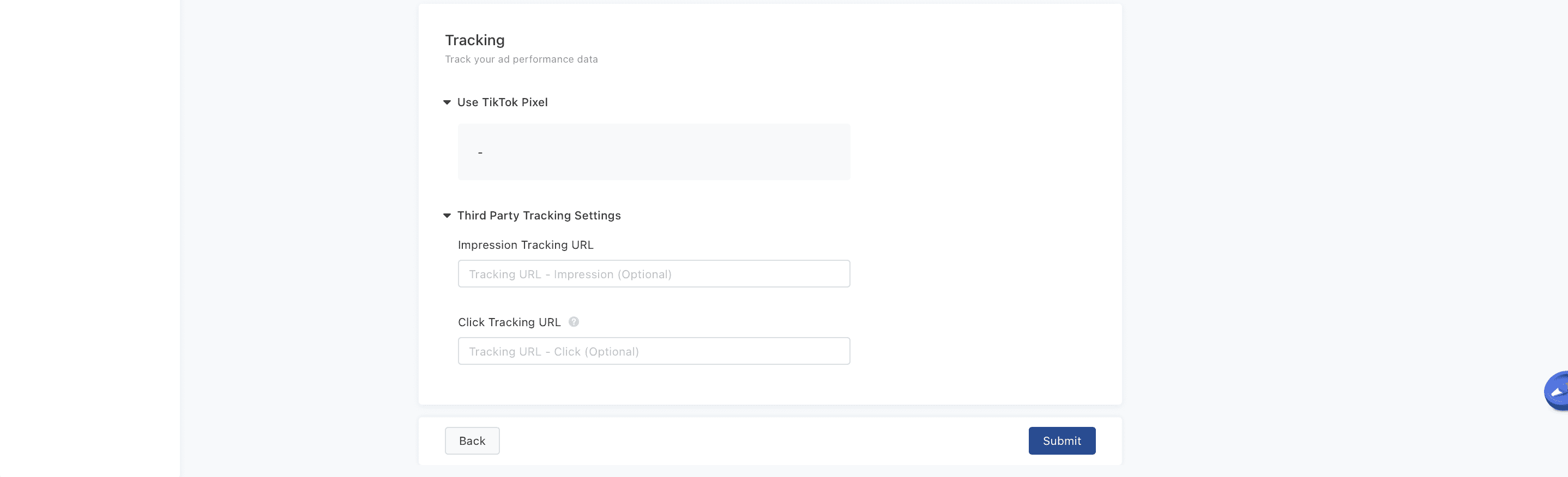 22. Finally, if you’re going to set up tracking via the TikTok pixel, you can enter that information here. TikTok Ads Manager will ask for your pixel information, as well as your tracking URLs. Click Submit when you’re finished.