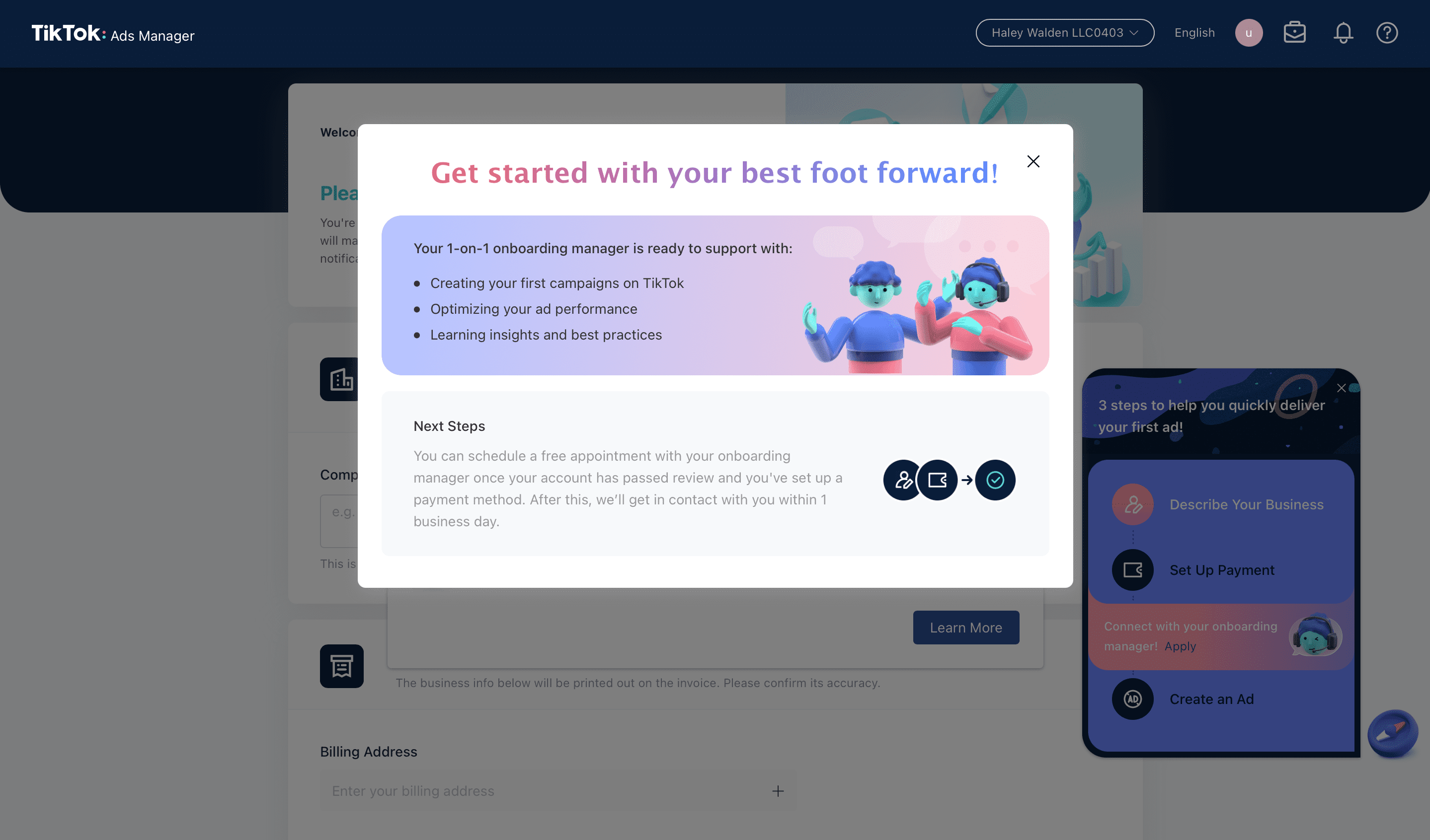 3. Next, you’ll get an onboarding message from the one-on-one onboarding manager. You’ll get support with creating your first TikTok advertising campaign, optimizing your ads for the best possible performance, learning the best practices for your TikTok ads, and how to monitor your ad insights for the best possible ROI.